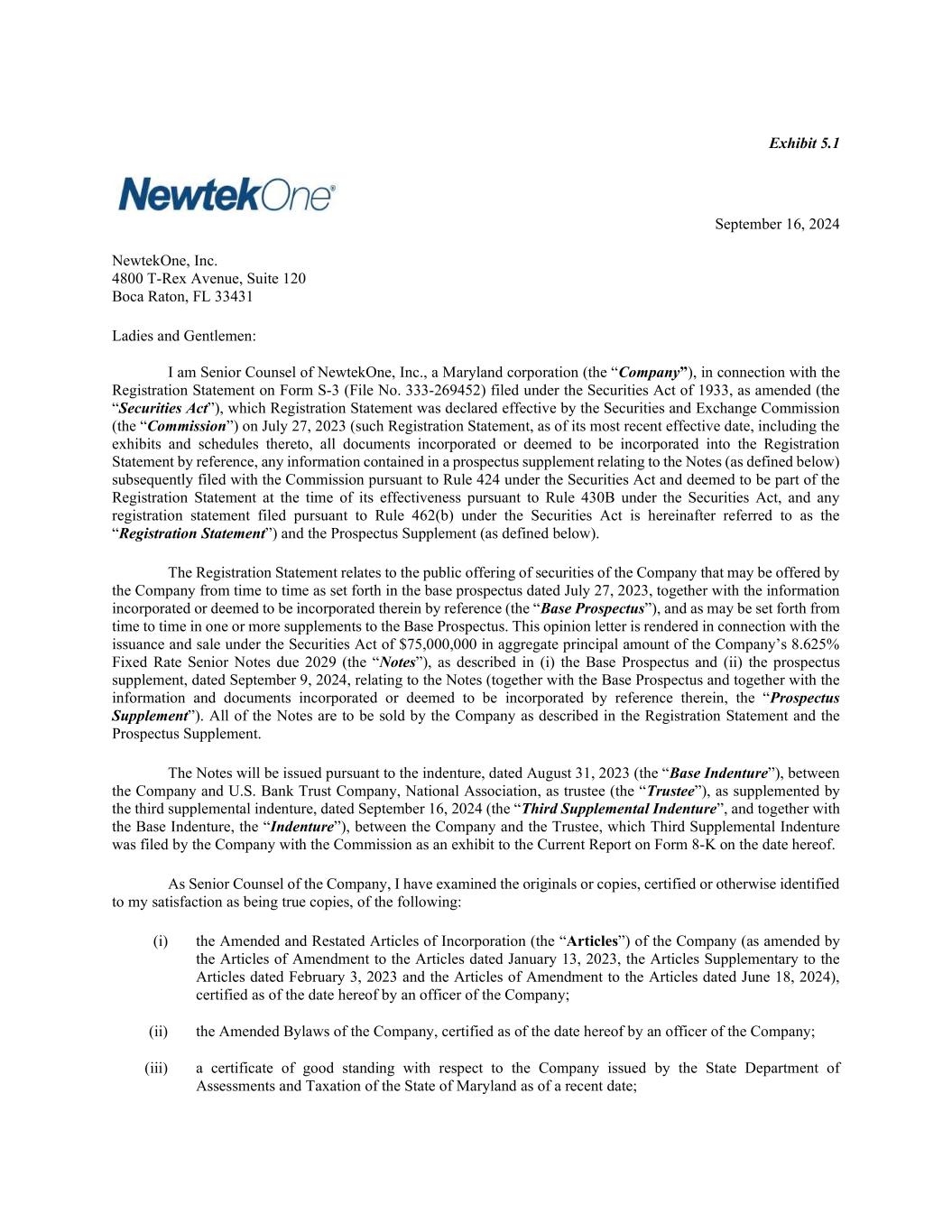 Exhibit 5.1 September 16, 2024 NewtekOne, Inc. 4800 T-Rex Avenue, Suite 120 Boca Raton, FL 33431 Ladies and Gentlemen: I am Senior Counsel of NewtekOne, Inc., a Maryland corporation (the “Company”), in connection with the Registration Statement on Form S-3 (File No. 333-269452) filed under the Securities Act of 1933, as amended (the “Securities Act”), which Registration Statement was declared effective by the Securities and Exchange Commission (the “Commission”) on July 27, 2023 (such Registration Statement, as of its most recent effective date, including the exhibits and schedules thereto, all documents incorporated or deemed to be incorporated into the Registration Statement by reference, any information contained in a prospectus supplement relating to the Notes (as defined below) subsequently filed with the Commission pursuant to Rule 424 under the Securities Act and deemed to be part of the Registration Statement at the time of its effectiveness pursuant to Rule 430B under the Securities Act, and any registration statement filed pursuant to Rule 462(b) under the Securities Act is hereinafter referred to as the “Registration Statement”) and the Prospectus Supplement (as defined below). The Registration Statement relates to the public offering of securities of the Company that may be offered by the Company from time to time as set forth in the base prospectus dated July 27, 2023, together with the information incorporated or deemed to be incorporated therein by reference (the “Base Prospectus”), and as may be set forth from time to time in one or more supplements to the Base Prospectus. This opinion letter is rendered in connection with the issuance and sale under the Securities Act of $75,000,000 in aggregate principal amount of the Company’s 8.625% Fixed Rate Senior Notes due 2029 (the “Notes”), as described in (i) the Base Prospectus and (ii) the prospectus supplement, dated September 9, 2024, relating to the Notes (together with the Base Prospectus and together with the information and documents incorporated or deemed to be incorporated by reference therein, the “Prospectus Supplement”). All of the Notes are to be sold by the Company as described in the Registration Statement and the Prospectus Supplement. The Notes will be issued pursuant to the indenture, dated August 31, 2023 (the “Base Indenture”), between the Company and U.S. Bank Trust Company, National Association, as trustee (the “Trustee”), as supplemented by the third supplemental indenture, dated September 16, 2024 (the “Third Supplemental Indenture”, and together with the Base Indenture, the “Indenture”), between the Company and the Trustee, which Third Supplemental Indenture was filed by the Company with the Commission as an exhibit to the Current Report on Form 8-K on the date hereof. As Senior Counsel of the Company, I have examined the originals or copies, certified or otherwise identified to my satisfaction as being true copies, of the following: (i) the Amended and Restated Articles of Incorporation (the “Articles”) of the Company (as amended by the Articles of Amendment to the Articles dated January 13, 2023, the Articles Supplementary to the Articles dated February 3, 2023 and the Articles of Amendment to the Articles dated June 18, 2024), certified as of the date hereof by an officer of the Company; (ii) the Amended Bylaws of the Company, certified as of the date hereof by an officer of the Company; (iii) a certificate of good standing with respect to the Company issued by the State Department of Assessments and Taxation of the State of Maryland as of a recent date;