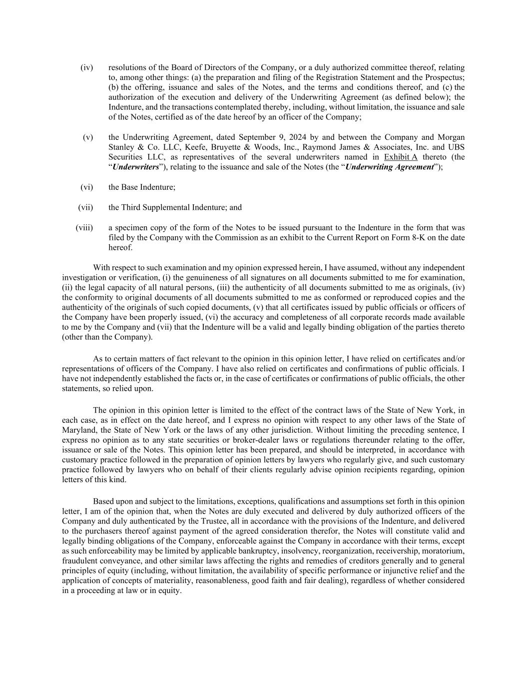 (iv) resolutions of the Board of Directors of the Company, or a duly authorized committee thereof, relating to, among other things: (a) the preparation and filing of the Registration Statement and the Prospectus; (b) the offering, issuance and sales of the Notes, and the terms and conditions thereof, and (c) the authorization of the execution and delivery of the Underwriting Agreement (as defined below); the Indenture, and the transactions contemplated thereby, including, without limitation, the issuance and sale of the Notes, certified as of the date hereof by an officer of the Company; (v) the Underwriting Agreement, dated September 9, 2024 by and between the Company and Morgan Stanley & Co. LLC, Keefe, Bruyette & Woods, Inc., Raymond James & Associates, Inc. and UBS Securities LLC, as representatives of the several underwriters named in Exhibit A thereto (the “Underwriters”), relating to the issuance and sale of the Notes (the “Underwriting Agreement”); (vi) the Base Indenture; (vii) the Third Supplemental Indenture; and (viii) a specimen copy of the form of the Notes to be issued pursuant to the Indenture in the form that was filed by the Company with the Commission as an exhibit to the Current Report on Form 8-K on the date hereof. With respect to such examination and my opinion expressed herein, I have assumed, without any independent investigation or verification, (i) the genuineness of all signatures on all documents submitted to me for examination, (ii) the legal capacity of all natural persons, (iii) the authenticity of all documents submitted to me as originals, (iv) the conformity to original documents of all documents submitted to me as conformed or reproduced copies and the authenticity of the originals of such copied documents, (v) that all certificates issued by public officials or officers of the Company have been properly issued, (vi) the accuracy and completeness of all corporate records made available to me by the Company and (vii) that the Indenture will be a valid and legally binding obligation of the parties thereto (other than the Company). As to certain matters of fact relevant to the opinion in this opinion letter, I have relied on certificates and/or representations of officers of the Company. I have also relied on certificates and confirmations of public officials. I have not independently established the facts or, in the case of certificates or confirmations of public officials, the other statements, so relied upon. The opinion in this opinion letter is limited to the effect of the contract laws of the State of New York, in each case, as in effect on the date hereof, and I express no opinion with respect to any other laws of the State of Maryland, the State of New York or the laws of any other jurisdiction. Without limiting the preceding sentence, I express no opinion as to any state securities or broker-dealer laws or regulations thereunder relating to the offer, issuance or sale of the Notes. This opinion letter has been prepared, and should be interpreted, in accordance with customary practice followed in the preparation of opinion letters by lawyers who regularly give, and such customary practice followed by lawyers who on behalf of their clients regularly advise opinion recipients regarding, opinion letters of this kind. Based upon and subject to the limitations, exceptions, qualifications and assumptions set forth in this opinion letter, I am of the opinion that, when the Notes are duly executed and delivered by duly authorized officers of the Company and duly authenticated by the Trustee, all in accordance with the provisions of the Indenture, and delivered to the purchasers thereof against payment of the agreed consideration therefor, the Notes will constitute valid and legally binding obligations of the Company, enforceable against the Company in accordance with their terms, except as such enforceability may be limited by applicable bankruptcy, insolvency, reorganization, receivership, moratorium, fraudulent conveyance, and other similar laws affecting the rights and remedies of creditors generally and to general principles of equity (including, without limitation, the availability of specific performance or injunctive relief and the application of concepts of materiality, reasonableness, good faith and fair dealing), regardless of whether considered in a proceeding at law or in equity.