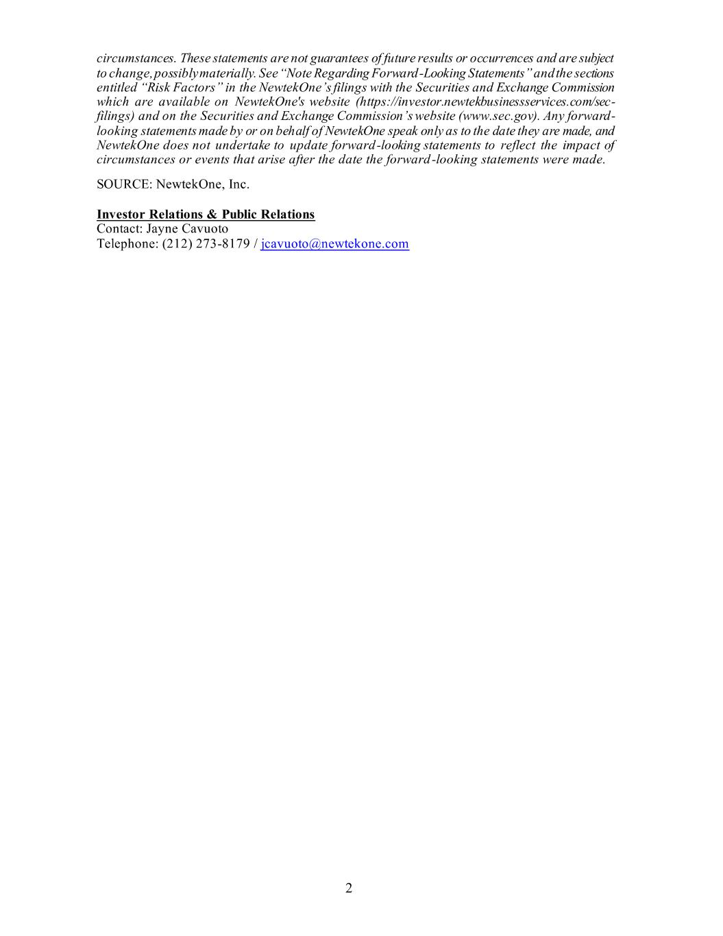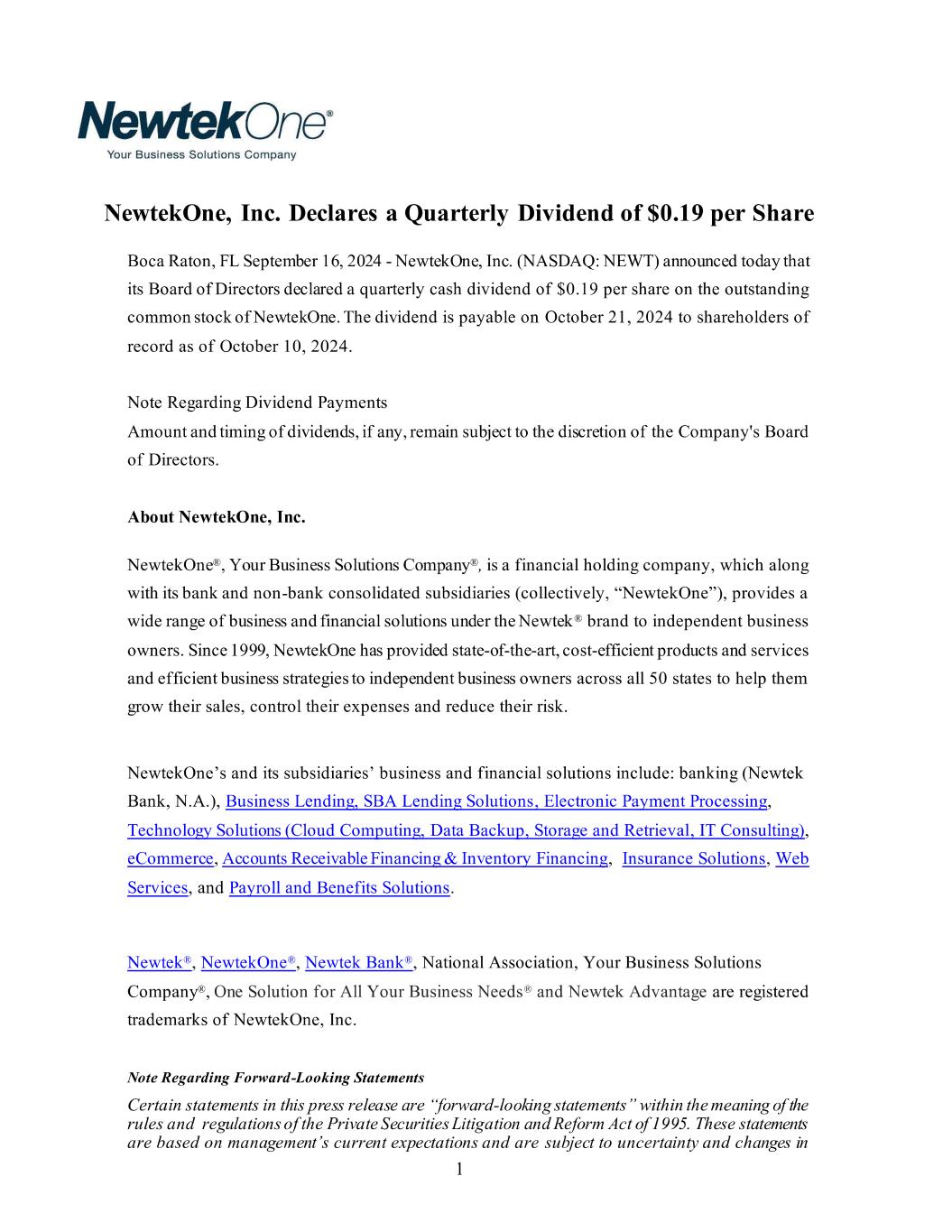 Statements in NewtekOne, Inc.’s (“NewtekOne” or the “Company”) Current Report on Form 8-K (including the exhibit) contain forward-looking statements within the meaning of the Private Securities Litigation Reform Act of 1995. These statements are based on management’s current expectations and beliefs and are subject to significant risks and uncertainties. Actual results may differ from those set forth in the forward-looking statements. See “Note Regarding Forward-Looking Statements” and the sections entitled “Risk Factors” in the Company's filings with the Securities and Exchange Commission which are available on NewtekOne's website (https://investor.newtekbusinessservices.com/sec-filings) and on the Securities and Exchange Commission’s website (www.sec.gov). Any forward-looking statements made by or on behalf of NewtekOne speak only as to the date they are made, and NewtekOne does not undertake to update forward-looking statements to reflect the impact of circumstances or events that arise after the date the forward-looking statements were made.