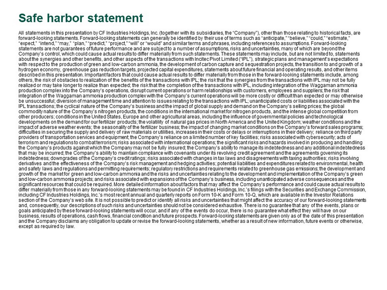 Safe harbor statement All statements in this presentation by CF Industries Holdings, Inc. (together with its subsidiaries, the “Company”), other th an those relating to historical facts, are forward - looking statements. Forward - looking statements can generally be identified by their use of terms such as “anticipate,” “ believe,” “could,” “estimate,” “expect,” “intend,” “may,” “plan,” “predict,” “project,” “will” or “would” and similar terms and phrases, including reference s t o assumptions. Forward - looking statements are not guarantees of future performance and are subject to a number of assumptions, risks and uncertainties, many of which are beyond the Company’s control, which could cause actual results to differ materially from such statements. These statements may include, but are not limited to, statements about the synergies and other benefits, and other aspects of the transactions with Incitec Pivot Limited (“IPL”), strategic p lan s and management’s expectations with respect to the production of green and low - carbon ammonia, the development of carbon capture and sequestration projects, th e transition to and growth of a hydrogen economy, greenhouse gas reduction targets, projected capital expenditures, statements about future financial and ope rat ing results, and other items described in this presentation. Important factors that could cause actual results to differ materially from those in the forw ard - looking statements include, among others, the risk of obstacles to realization of the benefits of the transactions with IPL; the risk that the synergies from t he transactions with IPL may not be fully realized or may take longer to realize than expected; the risk that the completion of the transactions with IPL, including in teg ration of the Waggaman ammonia production complex into the Company’s operations, disrupt current operations or harm relationships with customers, employees and suppliers; the risk that integration of the Waggaman ammonia production complex with the Company’s current operations will be more costly or difficult th an expected or may otherwise be unsuccessful; diversion of management time and attention to issues relating to the transactions with IPL; unanticipated co sts or liabilities associated with the IPL transactions; the cyclical nature of the Company’s business and the impact of global supply and demand on the Company’s s ell ing prices; the global commodity nature of the Company’s nitrogen products, the conditions in the international market for nitrogen products, and th e i ntense global competition from other producers; conditions in the United States, Europe and other agricultural areas, including the influence of governmenta l p olicies and technological developments on the demand for our fertilizer products; the volatility of natural gas prices in North America and the United Kin gdom; weather conditions and the impact of adverse weather events; the seasonality of the fertilizer business; the impact of changing market conditions on the Co mpany’s forward sales programs; difficulties in securing the supply and delivery of raw materials or utilities, increases in their costs or delays or interru pti ons in their delivery; reliance on third party providers of transportation services and equipment; the Company’s reliance on a limited number of key facilities; risks assoc iat ed with cybersecurity; acts of terrorism and regulations to combat terrorism; risks associated with international operations; the significant risks and haza rds involved in producing and handling the Company’s products against which the Company may not be fully insured; the Company’s ability to manage its indebtedness a nd any additional indebtedness that may be incurred; the Company’s ability to maintain compliance with covenants under its revolving credit agreement and th e a greements governing its indebtedness; downgrades of the Company’s credit ratings; risks associated with changes in tax laws and disagreements with ta xin g authorities; risks involving derivatives and the effectiveness of the Company’s risk management and hedging activities; potential liabilities and expendit ure s related to environmental, health and safety laws and regulations and permitting requirements; regulatory restrictions and requirements related to greenhouse g as emissions; the development and growth of the market for green and low - carbon ammonia and the risks and uncertainties relating to the development and implementa tion of the Company’s green and low - carbon ammonia projects; and risks associated with expansions of the Company’s business, including unanticipated adverse consequences and the significant resources that could be required. More detailed information about factors that may affect the Company’s performan ce and could cause actual results to differ materially from those in any forward - looking statements may be found in CF Industries Holdings, Inc.’s filings with the S ecurities and Exchange Commission, including CF Industries Holdings, Inc.’s most recent annual and quarterly reports on Form 10 - K and Form 10 - Q, which are availabl e in the Investor Relations section of the Company’s web site. It is not possible to predict or identify all risks and uncertainties that might affect th e a ccuracy of our forward - looking statements and, consequently, our descriptions of such risks and uncertainties should not be considered exhaustive. There is no guarante e t hat any of the events, plans or goals anticipated by these forward - looking statements will occur, and if any of the events do occur, there is no guarantee what effect they will have on our business, results of operations, cash flows, financial condition and future prospects. Forward - looking statements are given only as of the date of this presentation and the Company disclaims any obligation to update or revise the