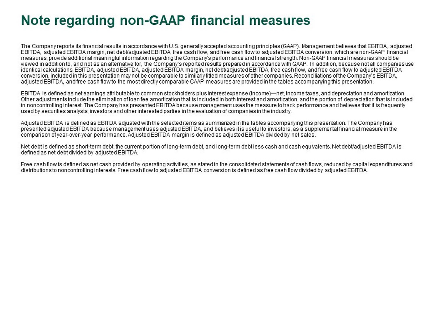 Note regarding non - GAAP financial measures The Company reports its financial results in accordance with U.S. generally accepted accounting principles (GAAP). Management be lieves that EBITDA, adjusted EBITDA, adjusted EBITDA margin, net debt/adjusted EBITDA, free cash flow, and free cash flow to adjusted EBITDA conversion, w hic h are non - GAAP financial measures, provide additional meaningful information regarding the Company's performance and financial strength. Non - GAAP financi al measures should be viewed in addition to, and not as an alternative for, the Company’s reported results prepared in accordance with GAAP. In add iti on, because not all companies use identical calculations, EBITDA, adjusted EBITDA, adjusted EBITDA margin, net debt/adjusted EBITDA, free cash flow, and free c ash flow to adjusted EBITDA conversion, included in this presentation may not be comparable to similarly titled measures of other companies. Reconciliati ons of the Company’s EBITDA, adjusted EBITDA, and free cash flow to the most directly comparable GAAP measures are provided in the tables accompanying thi s p resentation. EBITDA is defined as net earnings attributable to common stockholders plus interest expense (income) — net, income taxes, and depr eciation and amortization. Other adjustments include the elimination of loan fee amortization that is included in both interest and amortization, and th e p ortion of depreciation that is included in noncontrolling interest. The Company has presented EBITDA because management uses the measure to track performance and bel iev es that it is frequently used by securities analysts, investors and other interested parties in the evaluation of companies in the industry. Adjusted EBITDA is defined as EBITDA adjusted with the selected items as summarized in the tables accompanying this presentat ion . The Company has presented adjusted EBITDA because management uses adjusted EBITDA, and believes it is useful to investors, as a supplemental fin ancial measure in the comparison of year - over - year performance. Adjusted EBITDA margin is defined as adjusted EBITDA divided by net sales. Net debt is defined as short - term debt, the current portion of long - term debt, and long - term debt less cash and cash equivalents . Net debt/adjusted EBITDA is defined as net debt divided by adjusted EBITDA. Free cash flow is defined as net cash provided by operating activities, as stated in the consolidated statements of cash flow s, reduced by capital expenditures and distributions to noncontrolling interests. Free cash flow to adjusted EBITDA conversion is defined as free cash flow divided by adjusted EBITDA.