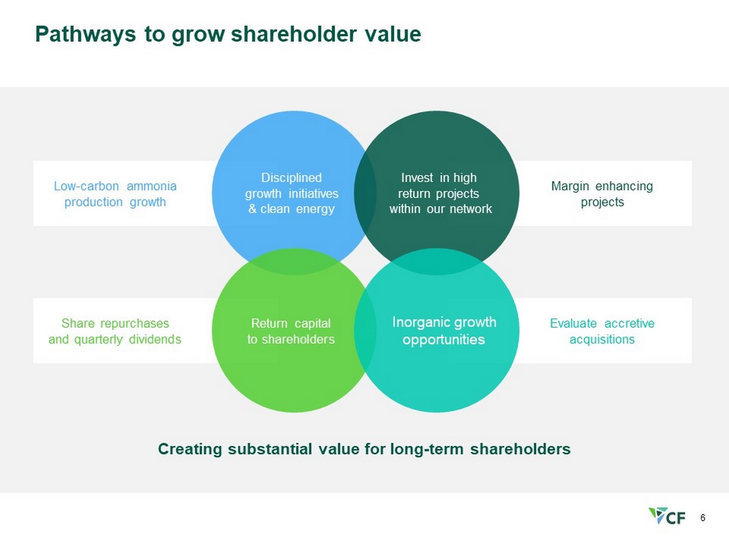 6 Evaluate accretive acquisitions Margin enhancing projects Share repurchases and quarterly dividends Low - carbon ammonia production growth Pathways to grow shareholder value Creating substantial value for long - term shareholders Return capital to shareholders Inorganic growth opportunities Invest in high return projects within our network Disciplined growth initiatives & clean energy