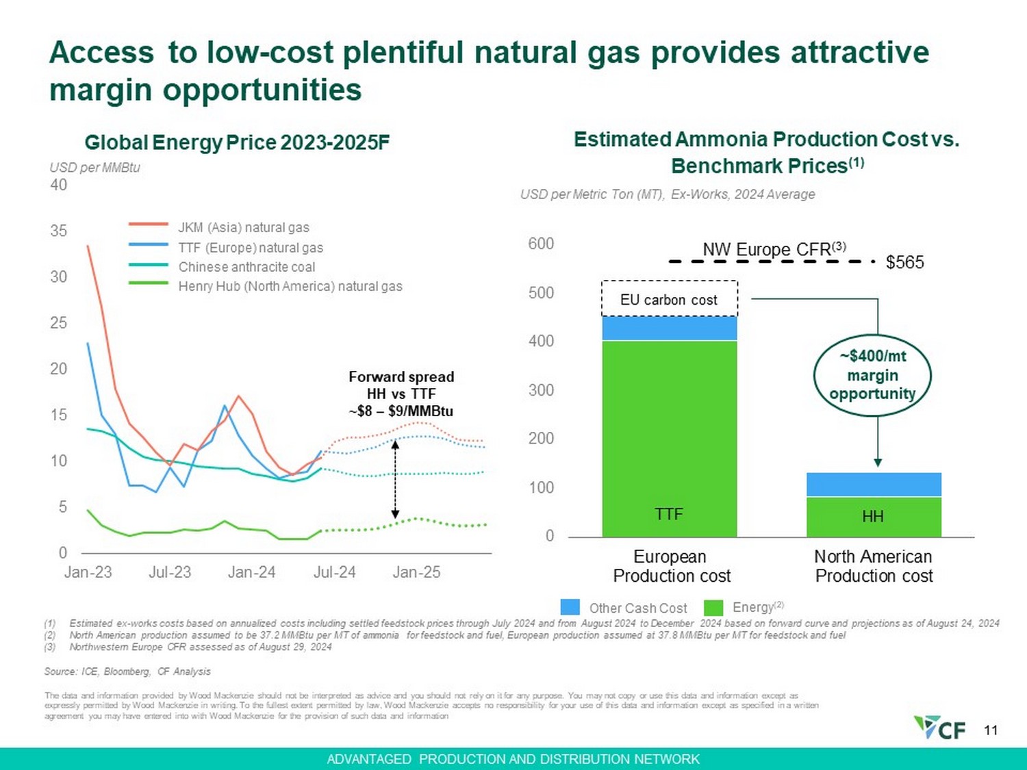 11 Global Energy Price 2023 - 2025F (1) Estimated ex - works costs based on annualized costs including settled feedstock prices through July 2024 and from August 2024 to December 2024 based on forward curve and projections as of August 24, 2024 (2) North American production assumed to be 37.2 MMBtu per MT of ammonia for feedstock and fuel, European production assumed at 3 7.8 MMBtu per MT for feedstock and fuel (3) Northwestern Europe CFR assessed as of August 29, 2024 Source: ICE, Bloomberg, CF Analysis Access to low - cost plentiful natural gas provides attractive margin opportunities 0 5 10 15 20 25 30 35 40 Jan-23 Jul-23 Jan-24 Jul-24 Jan-25 Henry Hub (North America) natural gas TTF (Europe) natural gas Chinese anthracite coal JKM (Asia) natural gas USD per MMBtu Forward spread HH vs TTF ~$8 – $9/MMBtu The data and information provided by Wood Mackenzie should not be interpreted as advice and you should not rely on it for any pu rpose. You may not copy or use this data and information except as expressly permitted by Wood Mackenzie in writing. To the fullest extent permitted by law, Wood Mackenzie accepts no responsib ili ty for your use of this data and information except as specified in a written agreement you may have entered into with Wood Mackenzie for the provision of such data and information $565 0 100 200 300 400 500 600 European Production cost North American Production cost USD per Metric Ton (MT), Ex - Works, 2024 Average Estimated Ammonia Production Cost vs. Benchmark Prices (1) NW Europe CFR (3) Other Cash Cost Energy (2) EU carbon cost TTF HH ~$400/mt margin opportunity ADVANTAGED PRODUCTION AND DISTRIBUTION NETWORK