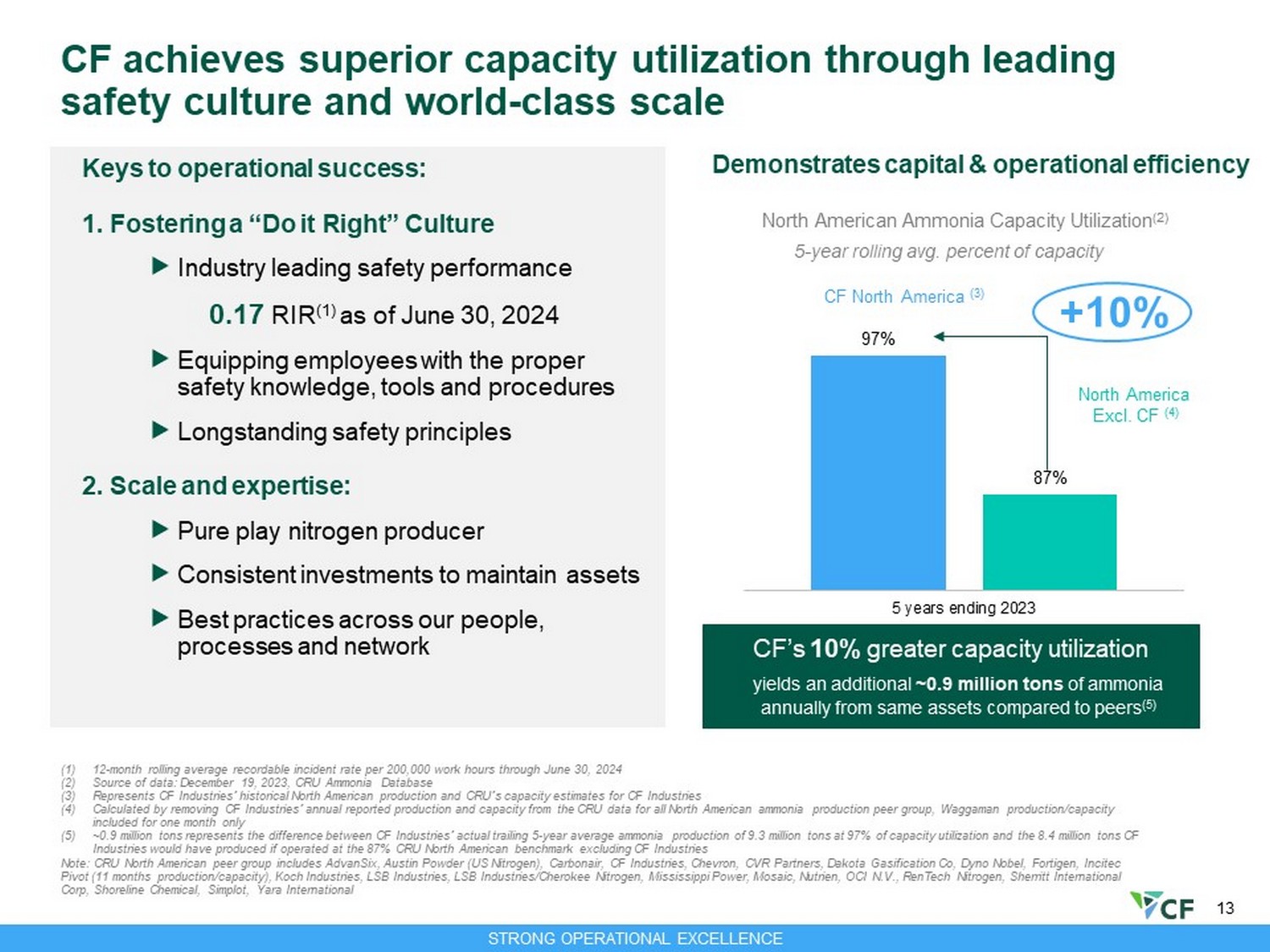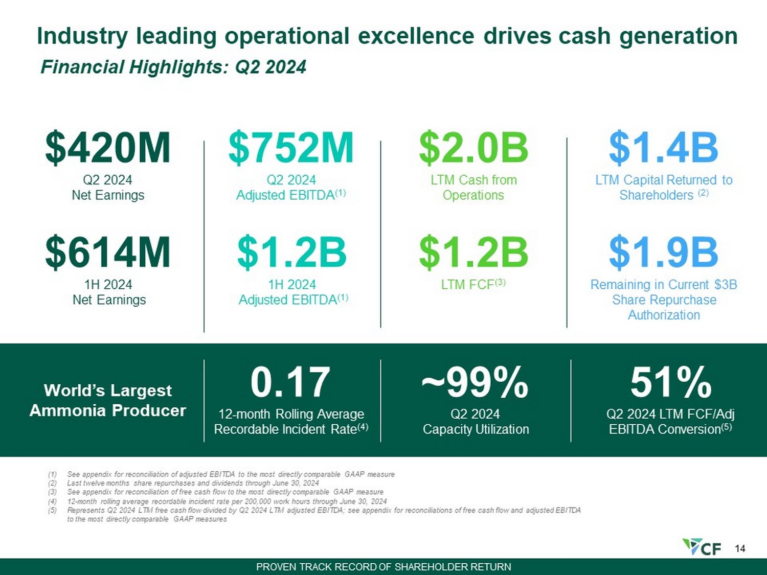 13 97% 87% 5 years ending 2023 5 - year rolling avg. percent of capacity CF’s 10% greater capacity utilization yields an additional ~0.9 million tons of ammonia annually from same assets compared to peers (5) CF North America (3) North America Excl. CF (4) (1) 12 - month rolling average recordable incident rate per 200,000 work hours through June 30, 2024 (2) Source of data: December 19, 2023, CRU Ammonia Database (3) Represents CF Industries’ historical North American production and CRU’s capacity estimates for CF Industries (4) Calculated by removing CF Industries’ annual reported production and capacity from the CRU data for all North American ammoni a p roduction peer group, Waggaman production/capacity included for one month only (5) ~0.9 million tons represents the difference between CF Industries’ actual trailing 5 - year average ammonia production of 9.3 mill ion tons at 97% of capacity utilization and the 8.4 million tons CF Industries would have produced if operated at the 87% CRU North American benchmark excluding CF Industries Note: CRU North American peer group includes AdvanSix, Austin Powder (US Nitrogen), Carbonair, CF Industries, Chevron, CVR Pa rtn ers, Dakota Gasification Co, Dyno Nobel, Fortigen, Incitec Pivot (11 months production/capacity), Koch Industries, LSB Industries, LSB Industries/Cherokee Nitrogen, Mississippi Power, Mos aic, Nutrien, OCI N.V., RenTech Nitrogen, Sherritt International Corp, Shoreline Chemical, Simplot, Yara International North American Ammonia Capacity Utilization (2) CF achieves superior capacity utilization through leading safety culture and world - class scale +10% Keys to operational success: 1. Fostering a “Do it Right” Culture Industry leading safety performance 0.17 RIR (1) as of June 30, 2024 Equipping employees with the proper safety knowledge, tools and procedures Longstanding safety principles 2. Scale and expertise: Pure play nitrogen producer Consistent investments to maintain assets Best practices across our people, processes and network STRONG OPERATIONAL EXCELLENCE Demonstrates capital & operational efficiency