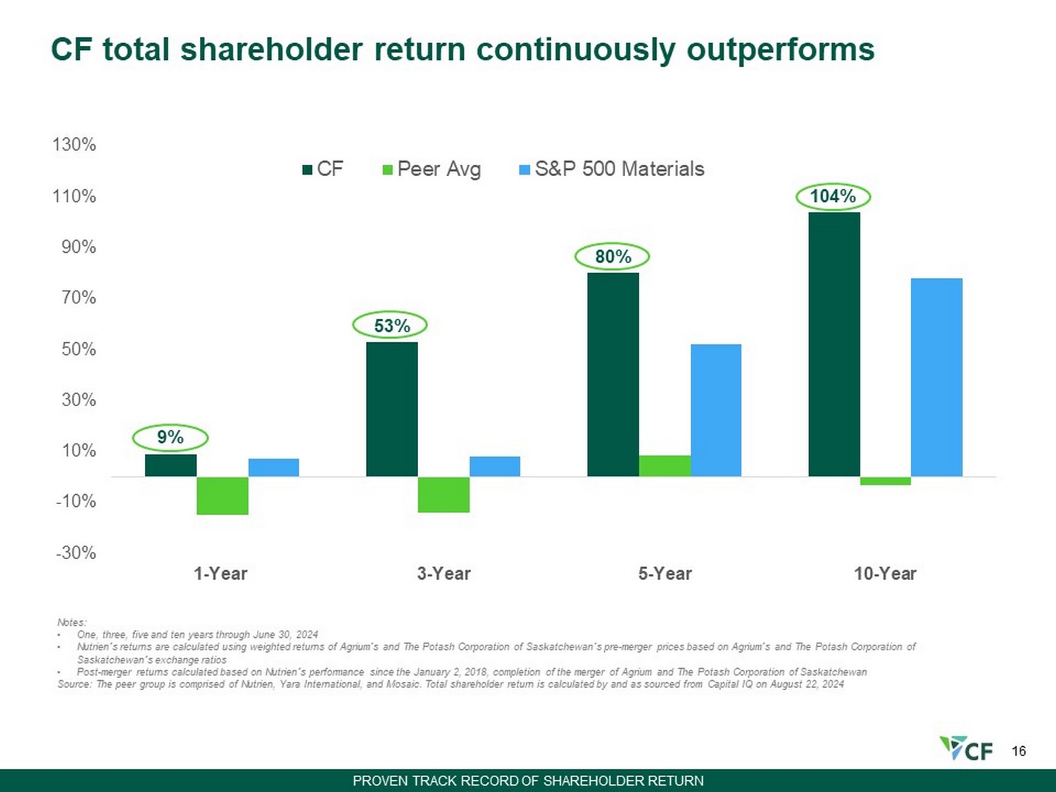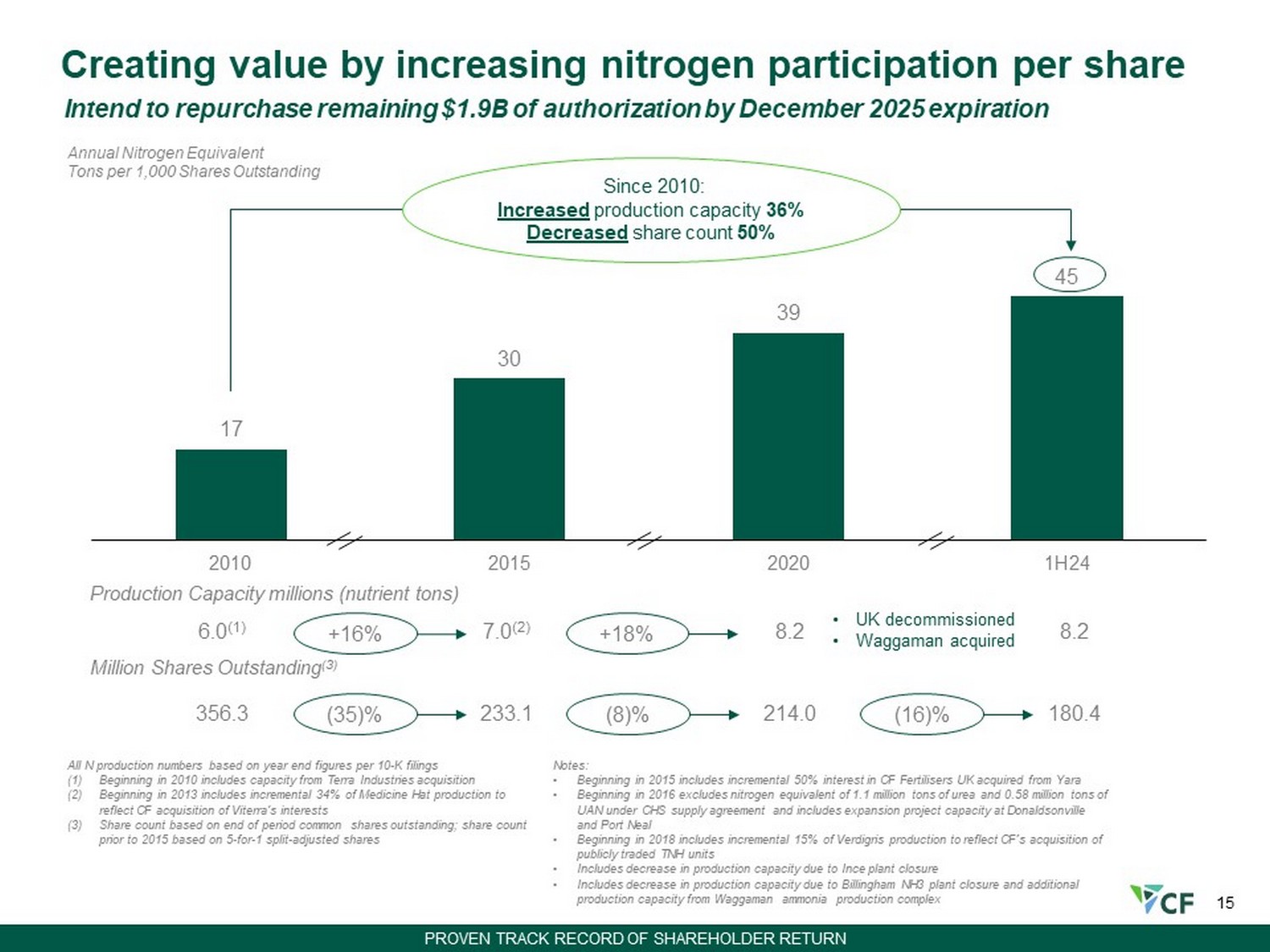 15 8.2 8.2 7.0 (2) 6.0 (1) Production Capacity millions (nutrient tons) Annual Nitrogen Equivalent Tons per 1,000 Shares Outstanding 17 30 39 45 2010 2015 2020 1H24 Creating value by increasing nitrogen participation per share Million Shares Outstanding (3) Since 2010: Increased production capacity 36% Decreased share count 50% 180.4 214.0 233.1 356.3 +16% (35)% +18% (8)% (16)% • UK decommissioned • Waggaman acquired Notes: • Beginning in 2015 includes incremental 50% interest in CF Fertilisers UK acquired from Yara • Beginning in 2016 excludes nitrogen equivalent of 1.1 million tons of urea and 0.58 million tons of UAN under CHS supply agreement and includes expansion project capacity at Donaldsonville and Port Neal • Beginning in 2018 includes incremental 15% of Verdigris production to reflect CF’s acquisition of publicly traded TNH units • Includes decrease in production capacity due to Ince plant closure • Includes decrease in production capacity due to Billingham NH3 plant closure and additional production capacity from Waggaman ammonia production complex All N production numbers based on year end figures per 10 - K filings (1) Beginning in 2010 includes capacity from Terra Industries acquisition (2) Beginning in 2013 includes incremental 34% of Medicine Hat production to reflect CF acquisition of Viterra's interests (3) Share count based on end of period common shares outstanding; share count prior to 2015 based on 5 - for - 1 split - adjusted shares Intend to repurchase remaining $1.9B of authorization by December 2025 expiration PROVEN TRACK RECORD OF SHAREHOLDER RETURN