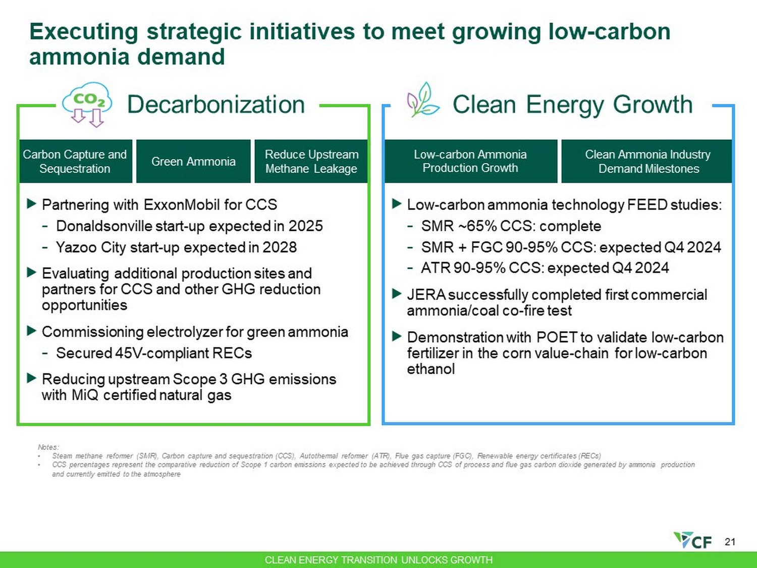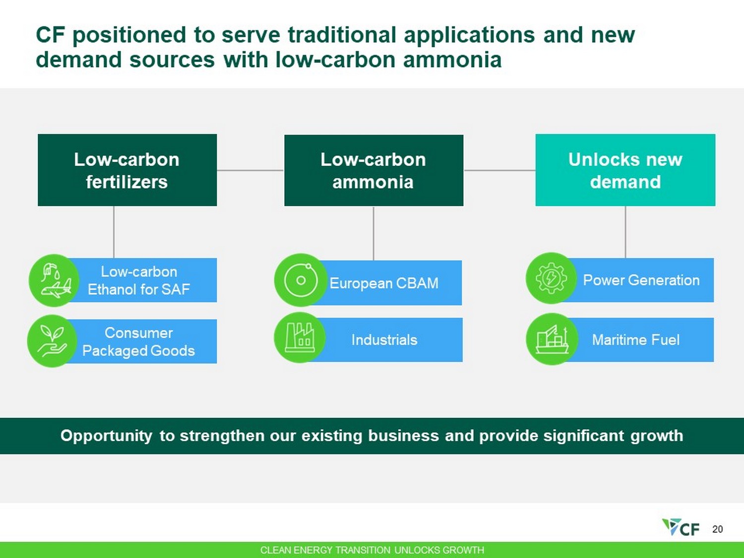 20 CF positioned to serve traditional applications and new demand sources with low - carbon ammonia Opportunity to strengthen our existing business and provide significant growth Low - carbon Ethanol for SAF Consumer Packaged Goods Low - carbon fertilizers European CBAM Industrials Low - carbon ammonia Power Generation Maritime Fuel Unlocks new demand CLEAN ENERGY TRANSITION UNLOCKS GROWTH