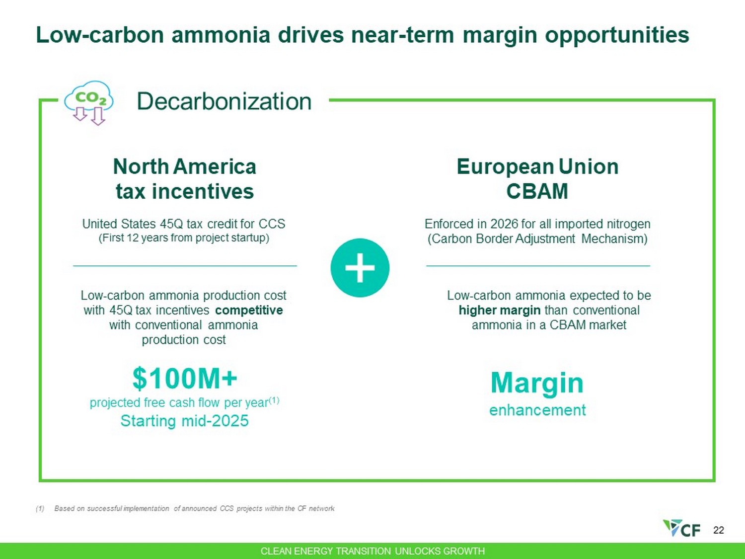 21 Executing strategic initiatives to meet growing low - carbon ammonia demand Low - carbon Ammonia Production Growth Clean Ammonia Industry Demand Milestones Reduce Upstream Methane Leakage Green Ammonia Carbon Capture and Sequestration Partnering with ExxonMobil for CCS - Donaldsonville start - up expected in 2025 - Yazoo City start - up expected in 2028 Evaluating additional production sites and partners for CCS and other GHG reduction opportunities Commissioning electrolyzer for green ammonia - Secured 45V - compliant RECs Reducing upstream Scope 3 GHG emissions with MiQ certified natural gas Low - carbon ammonia technology FEED studies: - SMR ~65% CCS: complete - SMR + FGC 90 - 95% CCS: expected Q4 2024 - ATR 90 - 95% CCS: expected Q4 2024 JERA successfully completed first commercial ammonia/coal co - fire test Demonstration with POET to validate low - carbon fertilizer in the corn value - chain for low - carbon ethanol Decarbonization Clean Energy Growth CLEAN ENERGY TRANSITION UNLOCKS GROWTH Notes: • Steam methane reformer (SMR), Carbon capture and sequestration (CCS), Autothermal reformer (ATR), Flue gas capture (FGC), Ren ewa ble energy certificates (RECs) • CCS percentages represent the comparative reduction of Scope 1 carbon emissions expected to be achieved through CCS of process a nd flue gas carbon dioxide generated by ammonia production and currently emitted to the atmosphere