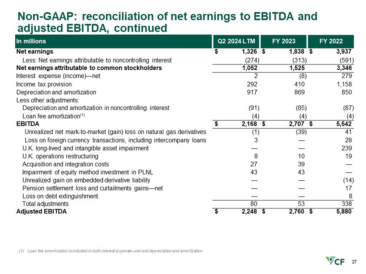 Financial results – second quarter and first half 2024 1H 2023 1H 2024 Q2 2023 Q2 2024 In millions, except percentages, per MMBtu and EPS $ 3,787 $ 3,042 $ 1,775 $ 1,572 Net sales 1,667 1,088 804 679 Gross margin 44.0 % 35.8 % 45.3 % 43.2 % - As a percentage of net sales $ 1,087 $ 614 $ 527 $ 420 Net earnings attributable to common stockholders 5.55 3.31 2.70 2.30 Net earnings per diluted share 1,779 1,240 855 752 EBITDA (1) 1,723 1,211 857 752 Adjusted EBITDA (1) 195.9 185.5 195.0 182.8 Diluted weighted - average common shares outstanding $ 3.86 $ 2.30 $ 2.74 $ 1.90 Natural gas costs in cost of sales (per MMBtu) (2) 0.70 0.23 0.01 — Realized derivatives loss in cost of sales (per MMBtu) (3) Cost of natural gas used for production in cost of sales (per MMBtu) $ 1.90 $ 2.75 $ 2.53 $ 4.56 2.40 2.24 2.12 2.04 Average daily market price of natural gas Henry Hub - Louisiana (per MMBtu) 427 475 221 222 Depreciation and amortization 164 182 95 84 Capital expenditures (1) See appendix for reconciliations of EBITDA and adjusted EBITDA to the most directly comparable GAAP measures (2) Includes the cost of natural gas used for production and related transportation that is included in cost of sales during the period under the first - in, first - out inventory method (3) Includes realized gains and losses on natural gas derivatives settled during the period. Excludes unrealized mark - to - market gains and losses on natural gas derivatives 25