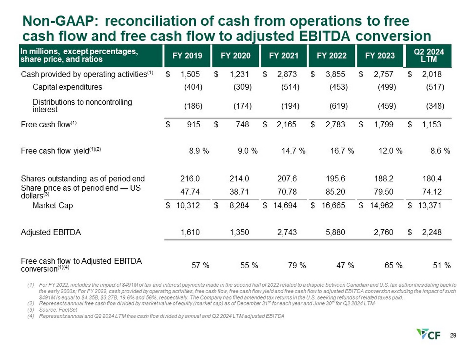 Non - GAAP: reconciliation of cash from operations to free cash flow and free cash flow to adjusted EBITDA conversion Q2 2024 LTM FY 2023 FY 2022 FY 2021 FY 2020 FY 2019 In millions, except percentages, share price, and ratios interest dollars (3) $ 2,018 $ 2,757 $ 3,855 $ 2,873 $ 1,231 $ 1,505 Cash provided by operating activities (1) (517) (499) (453) (514) (309) (404) Capital expenditures (348) (459) (619) (194) (174) (186) Distributions to noncontrolling 1,153 $ 1,799 $ 2,783 $ 2,165 $ 748 $ 915 $ Free cash flow (1) 8.6 % 12.0 % 16.7 % 14.7 % 9.0 % 8.9 % Free cash flow yield (1)(2) 180.4 188.2 195.6 207.6 214.0 216.0 Shares outstanding as of period end 74.12 79.50 85.20 70.78 38.71 47.74 Share price as of period end — US $ 13,371 $ 14,962 $ 16,665 $ 14,694 $ 8,284 $ 10,312 Market Cap $ 2,248 2,760 5,880 2,743 1,350 1,610 Adjusted EBITDA 51 % 65 % 47 % 79 % 55 % 57 % Free cash flow to Adjusted EBITDA conversion (1)(4) (1) For FY 2022, includes the impact of $491M of tax and interest payments made in the second half of 2022 related to a dispute between Canadian and U.S. tax authorities dating back to the early 2000s; For FY 2022, cash provided by operating activities, free cash flow, free cash flow yield and free cash flow to adjusted EBITDA conversion excluding the impact of such $491M is equal to $4.35B, $3.27B, 19.6% and 56%, respectively. The Company has filed amended tax returns in the U.S. seeking refunds of related taxes paid. (2) Represents annual free cash flow divided by market value of equity (market cap) as of December 31 st for each year and June 30 th for Q2 2024 LTM (3) Source: FactSet (4) Represents annual and Q2 2024 LTM free cash flow divided by annual and Q2 2024 LTM adjusted EBITDA 29