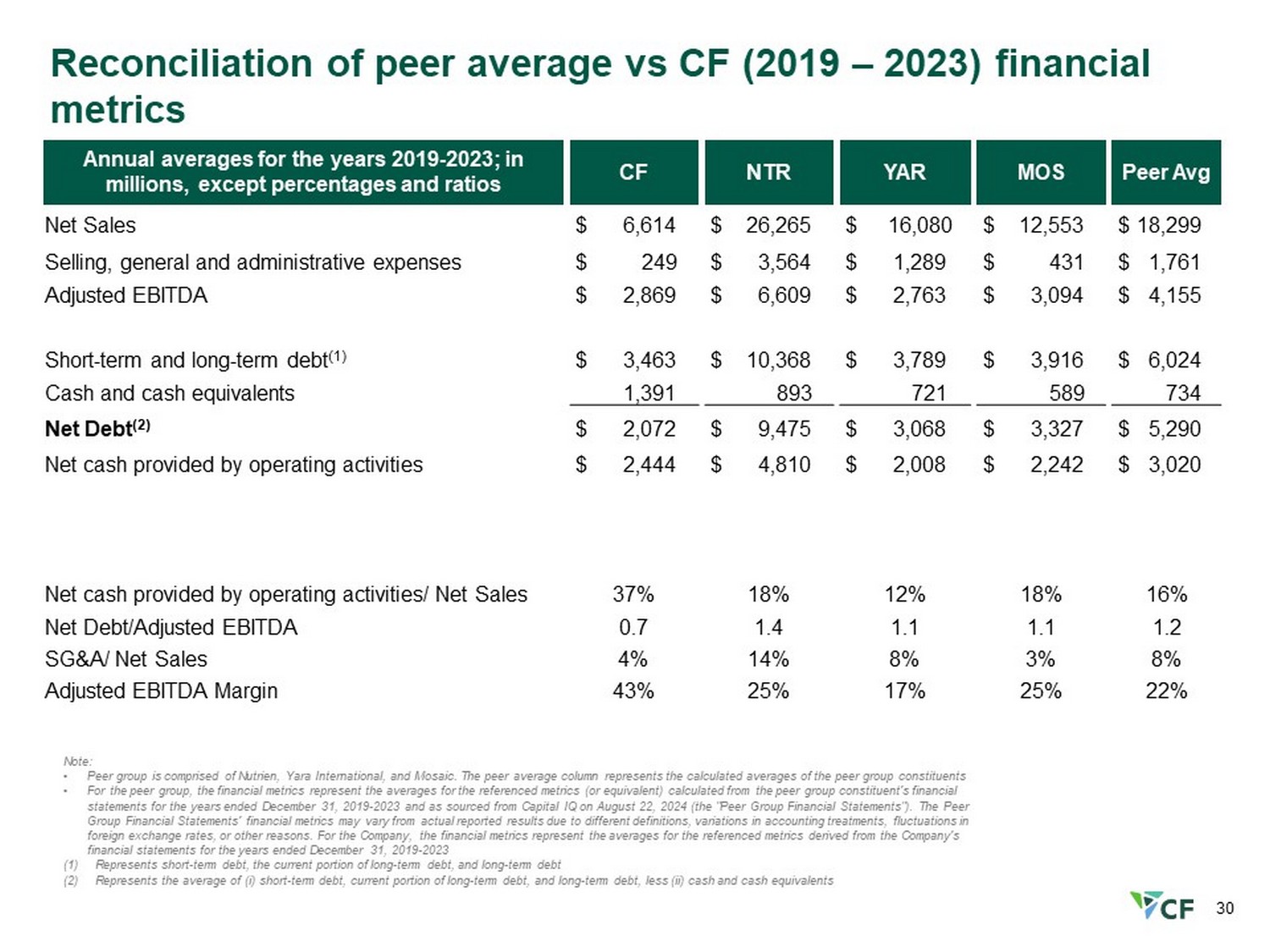 30 Reconciliation of peer average vs CF (2019 – 2023 ) financial metrics Note: • Peer group is comprised of Nutrien, Yara International, and Mosaic. The peer average column represents the calculated average s o f the peer group constituents • For the peer group, the financial metrics represent the averages for the referenced metrics (or equivalent) calculated from t he peer group constituent's financial statements for the years ended December 31, 2019 - 2023 and as sourced from Capital IQ on August 22, 2024 (the "Peer Group Financi al Statements"). The Peer Group Financial Statements' financial metrics may vary from actual reported results due to different definitions, variations in accounting treatments, fluctuations in foreign exchange rates, or other reasons. For the Company, the financial metrics represent the averages for the referenced me tri cs derived from the Company's financial statements for the years ended December 31, 2019 - 2023 (1) Represents short - term debt, the current portion of long - term debt, and long - term debt (2) Represents the average of ( i ) short - term debt, current portion of long - term debt, and long - term debt, less (ii) cash and cash equivalents Peer Avg MOS YAR NTR CF Annual averages for the years 2019 - 2023; in millions, except percentages and ratios $ 18,299 $ 12,553 $ 16,080 $ 26,265 $ 6,614 Net Sales $ 1,761 $ 431 $ 1,289 $ 3,564 $ 249 Selling, general and administrative expenses $ 4,155 $ 3,094 $ 2,763 $ 6,609 $ 2,869 Adjusted EBITDA $ 6,024 $ 3,916 $ 3,789 $ 10,368 $ 3,463 Short - term and long - term debt (1) 734 589 721 893 1,391 Cash and cash equivalents $ 5,290 $ 3,327 $ 3,068 $ 9,475 $ 2,072 Net Debt (2) $ 3,020 $ 2,242 $ 2,008 $ 4,810 $ 2,444 Net cash provided by operating activities 16% 18% 12% 18% 37% Net cash provided by operating activities/ Net Sales 1.2 1.1 1.1 1.4 0.7 Net Debt/Adjusted EBITDA 8% 3% 8% 14% 4% SG&A/ Net Sales 22% 25% 17% 25% 43% Adjusted EBITDA Margin