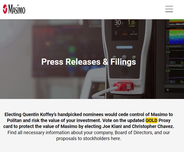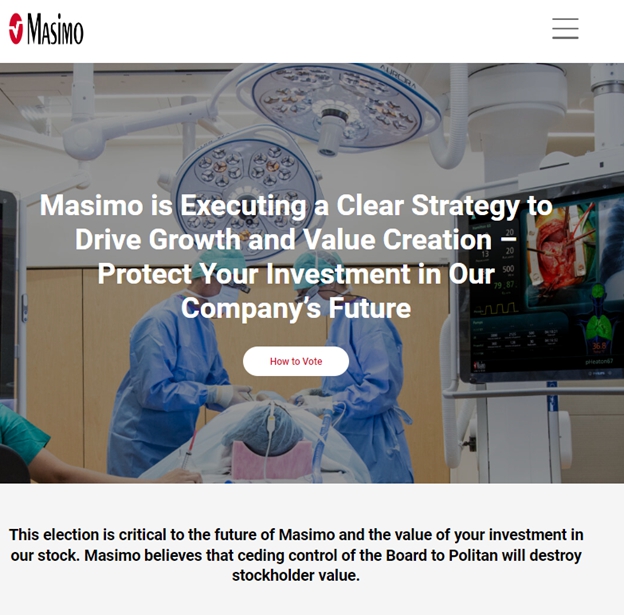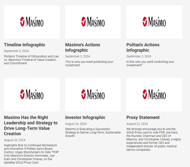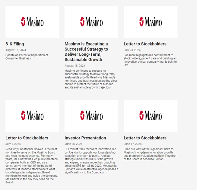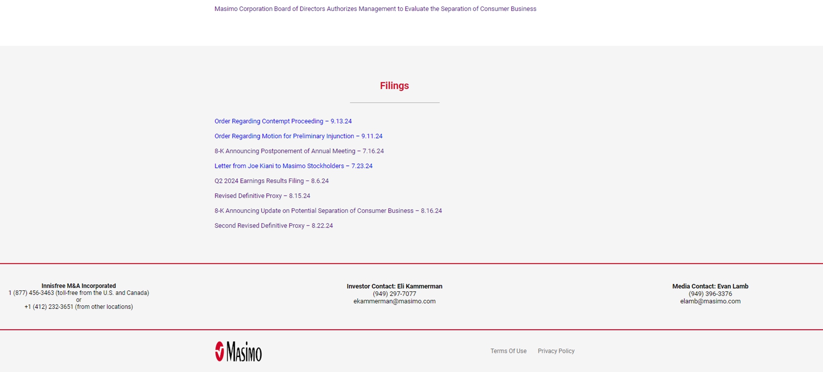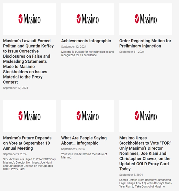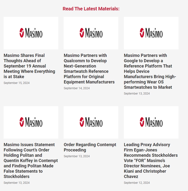 On September 16, 2024, Masimo Corporation (“Masimo” or the “Company”) made updates to its website, www.ProtectMasimosFuture.com, in connection with the 2024 Annual Meeting of Stockholders. A copy of the updated website content (other than content previously filed) can be found below.