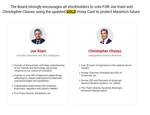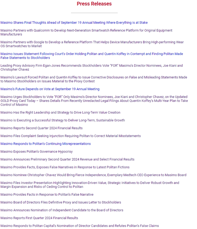This communication includes forward-looking statements as defined in Section 27A of the Securities Act of 1933, as amended, and Section 21E of the Securities Exchange Act of 1934, as amended, in connection with the Private Securities Litigation Reform Act of 1995. These forward-looking statements include, among others, statements regarding the 2024 Annual Meeting of Stockholders (the “2024 Annual Meeting”) of Masimo and the potential stockholder approval of the Board’s nominees. These forward-looking statements are based on current expectations about future events affecting Masimo and are subject to risks and uncertainties, all of which are difficult to predict and many of which are beyond Masimo’s control and could cause its actual results to differ materially and adversely from those expressed in its forward-looking statements as a result of various risk factors, including, but not limited to (i) uncertainties regarding the Litigation, (ii) uncertainties regarding future actions that may be taken by Politan in furtherance of its nomination of director candidates for election at the 2024 Annual Meeting, (iii) the potential cost and management distraction attendant to Politan’s nomination of director nominees at the 2024 Annual Meeting and (iv) factors discussed in the “Risk Factors” section of Masimo’s most recent periodic reports filed with the Securities and Exchange Commission (“SEC”), which may be obtained for free at the SEC’s website at www.sec.gov. Although Masimo believes that the expectations reflected in its forward-looking statements are reasonable, the Company does not know whether its expectations will prove correct. All forward-looking statements included in this communication are expressly qualified in their entirety by the foregoing cautionary statements. You are cautioned not to place undue reliance on these forward-looking statements, which speak only as of today’s date. Masimo does not undertake any obligation to update, amend or clarify these statements or the “Risk Factors” contained in the Company’s most recent reports filed with the SEC, whether as a result of new information, future events or otherwise, except as may be required under the applicable securities laws.