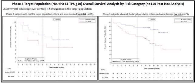 The new data presented at ESMO includes a further analysis of the 114 patients in the completed Phase 3 study who met these target population selection criteria and form the basis for the confirmatory study. Specifically, the new analysis focused on those patients who were deemed low risk for recurrence (recommended to be given only radiotherapy – but no chemotherapy, per National Comprehensive Cancer Network “NCCN” guidelines) following surgery (n=79) as opposed to the selected patients who were deemed high risk for recurrence and who were recommended to have chemotherapy added to their treatment following surgery per the same guidelines (n=35).