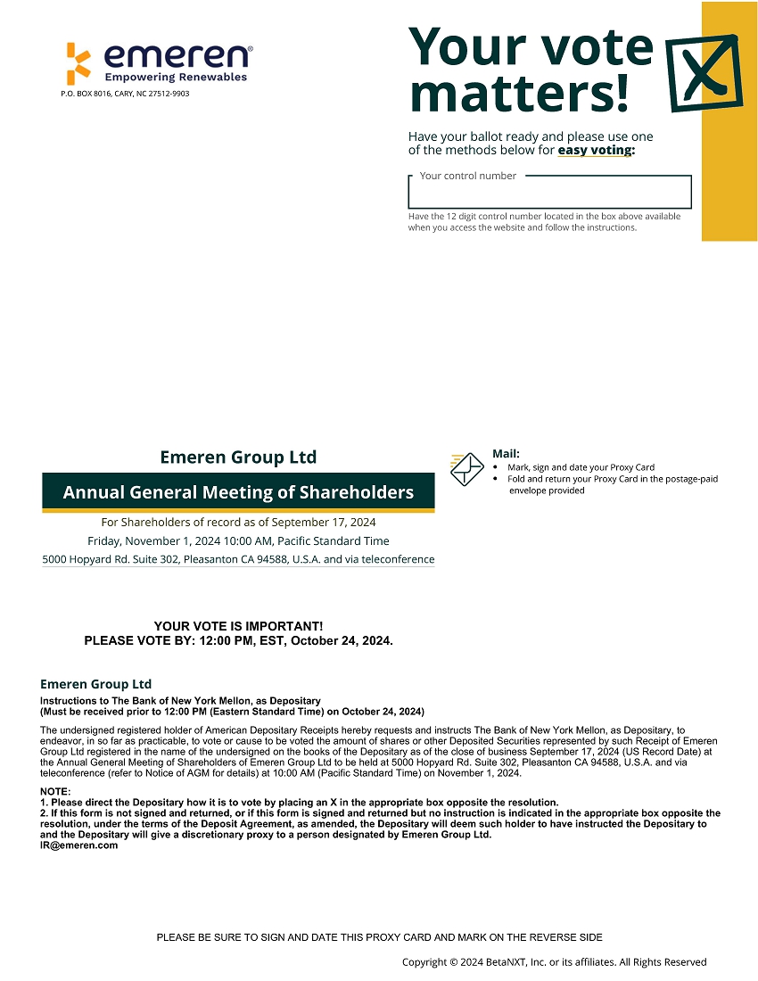 Important Notice Regarding the Availability of Proxy Materials for the Shareholder Meeting To Be Held on Friday, November 1, 2024. The Emeren Group Ltd proxy statement for the 2024 Annual Meeting of Shareholders and the 2023 Annual Report to Shareholders are available at www.proxyvote.com.