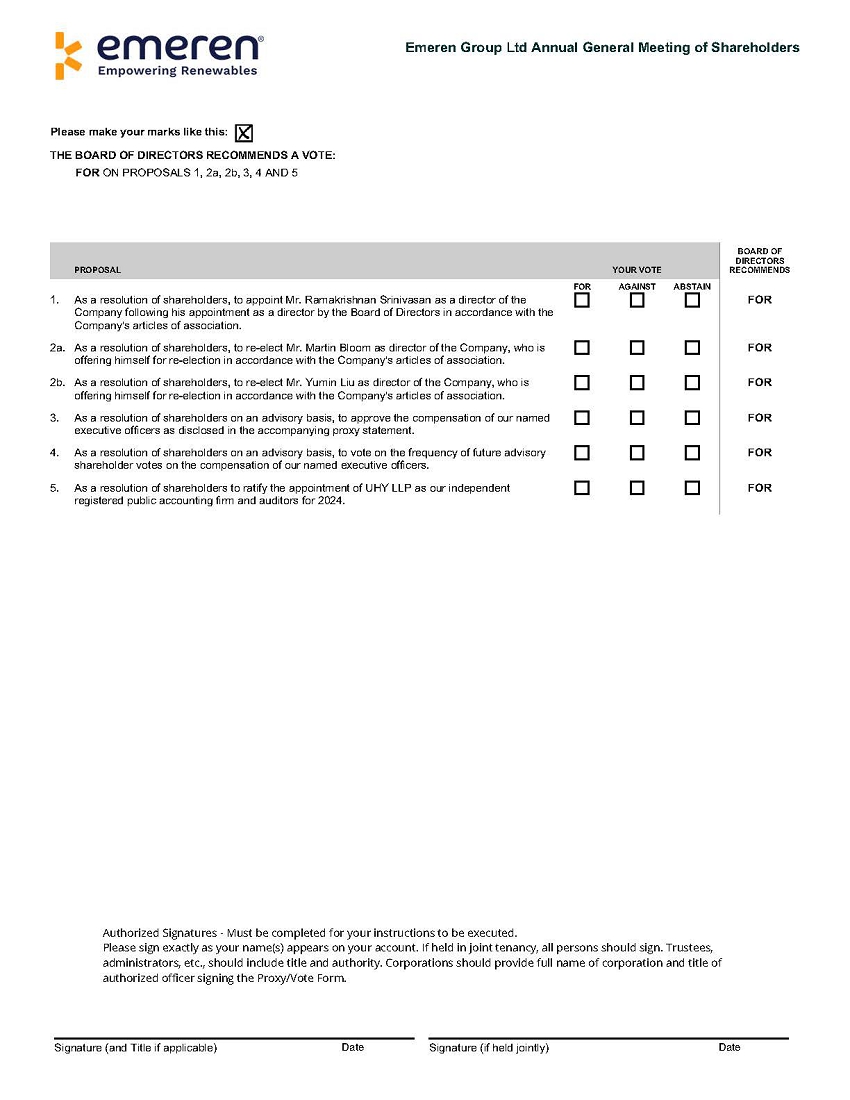 ![]() | Emeren Group Ltd Annual General Meeting of ShareholdersPlease make your marks like this:THE BOARD OF DIRECTORS RECOMMENDS A VOTE: FOR ON PROPOSALS 1, 2a, 2b, 3, 4 AND 5PROPOSAL YOUR VOTE FOR AGAINST ABSTAIN 1. As a resolution of shareholders, to appoint Mr. Ramakrishnan Srinivasan as a director of the Company following his appointment as a director by the Board of Directors in accordance with the Company's articles of association.BOARD OF DIRECTORS RECOMMENDSFOR2a. As a resolution of shareholders, to re-elect Mr. Martin Bloom as director of the Company, who is offering himself for re-election in accordance with the Company's articles of association.FOR2b. As a resolution of shareholders, to re-elect Mr. Yumin Liu as director of the Company, who is offering himself for re-election in accordance with the Company's articles of association.FOR3. As a resolution of shareholders on an advisory basis, to approve the compensation of our named executive officers as disclosed in the accompanying proxy statement.FOR4. As a resolution of shareholders on an advisory basis, to vote on the frequency of future advisory shareholder votes on the compensation of our named executive officers.FOR5. As a resolution of shareholders to ratify the appointment of UHY LLP as our independent registered public accounting firm and auditors for 2024.FORAuthorized Signatures - Must be completed for your instructions to be executed. Please sign exactly as your name(s) appears on your account. If held in joint tenancy, all persons should sign. Trustees, administrators, etc., should include title and authority. Corporations should provide full name of corporation and title of authorized officer signing the Proxy/Vote Form.Signature (and Title if applicable) DateSignature (if held jointly)Date |