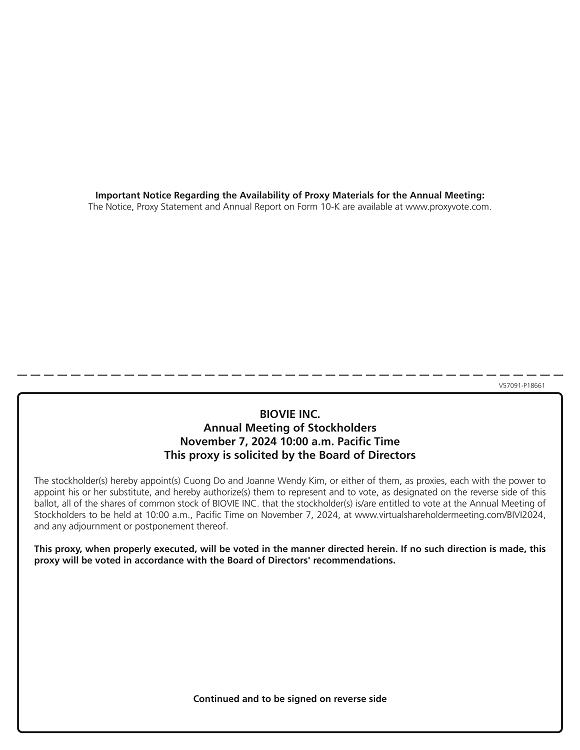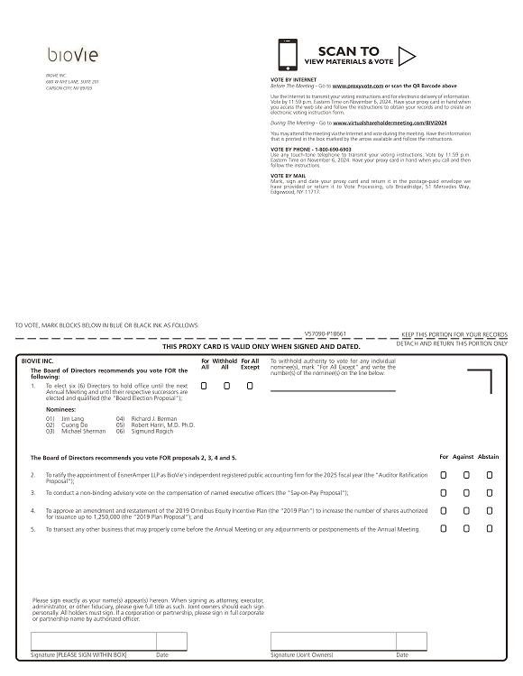 You are invited to participate in the 2024 Annual Meeting (the “Annual Meeting”) of stockholders of BioVie Inc., a Nevada corporation (“BioVie” or the “Company”), to be held on Thursday, November 7, 2024 at 10:00 a.m. Pacific Time. The Board of Directors has determined to convene and conduct the Annual Meeting on Thursday, November 7, 2024 at 10:00 a.m. Pacific Time, in a virtual meeting format at www.virtualshareholdermeeting.com/BIVI2024. Stockholders will NOT be able to attend the Annual Meeting in-person. The accompanying Proxy Statement includes instruction on how to access the virtual Annual Meeting and how to listen, vote, and submit questions from home or any remote location with Internet connectivity. At the Annual Meeting, we will consider and vote upon the following items: