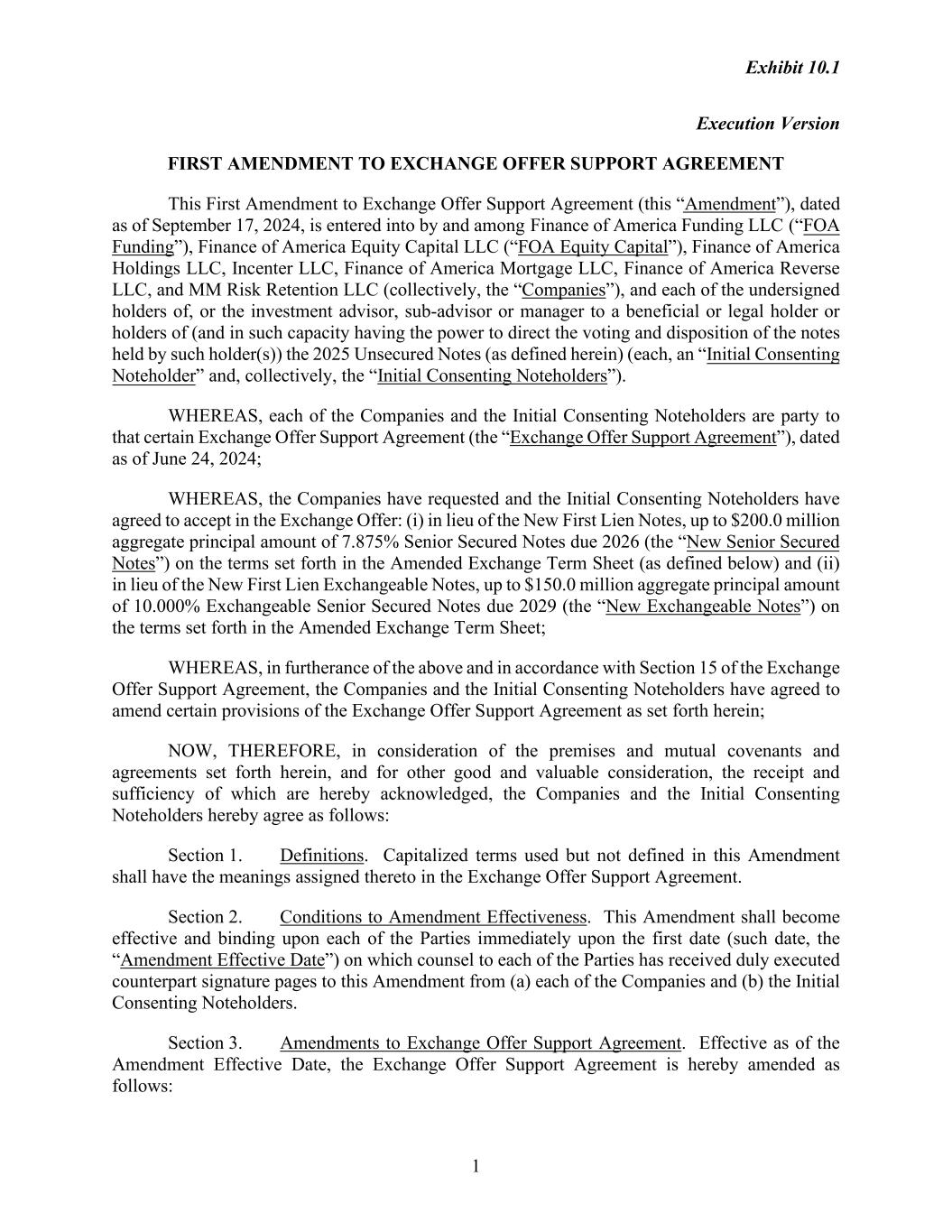 Exhibit 10.1 1 Execution Version FIRST AMENDMENT TO EXCHANGE OFFER SUPPORT AGREEMENT This First Amendment to Exchange Offer Support Agreement (this “Amendment”), dated as of September 17, 2024, is entered into by and among Finance of America Funding LLC (“FOA Funding”), Finance of America Equity Capital LLC (“FOA Equity Capital”), Finance of America Holdings LLC, Incenter LLC, Finance of America Mortgage LLC, Finance of America Reverse LLC, and MM Risk Retention LLC (collectively, the “Companies”), and each of the undersigned holders of, or the investment advisor, sub-advisor or manager to a beneficial or legal holder or holders of (and in such capacity having the power to direct the voting and disposition of the notes held by such holder(s)) the 2025 Unsecured Notes (as defined herein) (each, an “Initial Consenting Noteholder” and, collectively, the “Initial Consenting Noteholders”). WHEREAS, each of the Companies and the Initial Consenting Noteholders are party to that certain Exchange Offer Support Agreement (the “Exchange Offer Support Agreement”), dated as of June 24, 2024; WHEREAS, the Companies have requested and the Initial Consenting Noteholders have agreed to accept in the Exchange Offer: (i) in lieu of the New First Lien Notes, up to $200.0 million aggregate principal amount of 7.875% Senior Secured Notes due 2026 (the “New Senior Secured Notes”) on the terms set forth in the Amended Exchange Term Sheet (as defined below) and (ii) in lieu of the New First Lien Exchangeable Notes, up to $150.0 million aggregate principal amount of 10.000% Exchangeable Senior Secured Notes due 2029 (the “New Exchangeable Notes”) on the terms set forth in the Amended Exchange Term Sheet; WHEREAS, in furtherance of the above and in accordance with Section 15 of the Exchange Offer Support Agreement, the Companies and the Initial Consenting Noteholders have agreed to amend certain provisions of the Exchange Offer Support Agreement as set forth herein; NOW, THEREFORE, in consideration of the premises and mutual covenants and agreements set forth herein, and for other good and valuable consideration, the receipt and sufficiency of which are hereby acknowledged, the Companies and the Initial Consenting Noteholders hereby agree as follows: Section 1. Definitions. Capitalized terms used but not defined in this Amendment shall have the meanings assigned thereto in the Exchange Offer Support Agreement. Section 2. Conditions to Amendment Effectiveness. This Amendment shall become effective and binding upon each of the Parties immediately upon the first date (such date, the “Amendment Effective Date”) on which counsel to each of the Parties has received duly executed counterpart signature pages to this Amendment from (a) each of the Companies and (b) the Initial Consenting Noteholders. Section 3. Amendments to Exchange Offer Support Agreement. Effective as of the Amendment Effective Date, the Exchange Offer Support Agreement is hereby amended as follows: