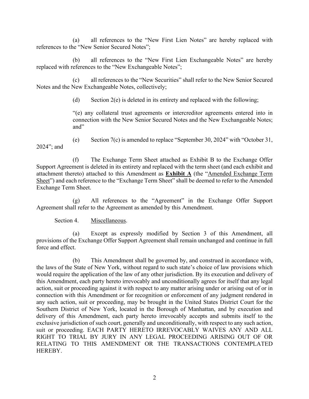 2 (a) all references to the “New First Lien Notes” are hereby replaced with references to the “New Senior Secured Notes”; (b) all references to the “New First Lien Exchangeable Notes” are hereby replaced with references to the “New Exchangeable Notes”; (c) all references to the “New Securities” shall refer to the New Senior Secured Notes and the New Exchangeable Notes, collectively; (d) Section 2(e) is deleted in its entirety and replaced with the following; “(e) any collateral trust agreements or intercreditor agreements entered into in connection with the New Senior Secured Notes and the New Exchangeable Notes; and” (e) Section 7(c) is amended to replace “September 30, 2024” with “October 31, 2024”; and (f) The Exchange Term Sheet attached as Exhibit B to the Exchange Offer Support Agreement is deleted in its entirety and replaced with the term sheet (and each exhibit and attachment thereto) attached to this Amendment as Exhibit A (the “Amended Exchange Term Sheet”) and each reference to the “Exchange Term Sheet” shall be deemed to refer to the Amended Exchange Term Sheet. (g) All references to the “Agreement” in the Exchange Offer Support Agreement shall refer to the Agreement as amended by this Amendment. Section 4. Miscellaneous. (a) Except as expressly modified by Section 3 of this Amendment, all provisions of the Exchange Offer Support Agreement shall remain unchanged and continue in full force and effect. (b) This Amendment shall be governed by, and construed in accordance with, the laws of the State of New York, without regard to such state’s choice of law provisions which would require the application of the law of any other jurisdiction. By its execution and delivery of this Amendment, each party hereto irrevocably and unconditionally agrees for itself that any legal action, suit or proceeding against it with respect to any matter arising under or arising out of or in connection with this Amendment or for recognition or enforcement of any judgment rendered in any such action, suit or proceeding, may be brought in the United States District Court for the Southern District of New York, located in the Borough of Manhattan, and by execution and delivery of this Amendment, each party hereto irrevocably accepts and submits itself to the exclusive jurisdiction of such court, generally and unconditionally, with respect to any such action, suit or proceeding. EACH PARTY HERETO IRREVOCABLY WAIVES ANY AND ALL RIGHT TO TRIAL BY JURY IN ANY LEGAL PROCEEDING ARISING OUT OF OR RELATING TO THIS AMENDMENT OR THE TRANSACTIONS CONTEMPLATED HEREBY.