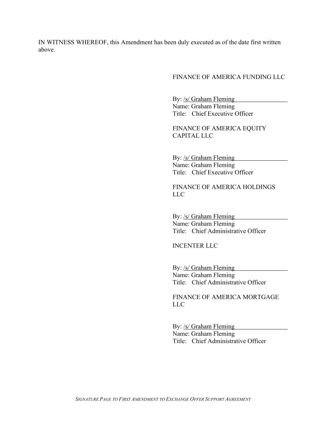 SIGNATURE PAGE TO FIRST AMENDMENT TO EXCHANGE OFFER SUPPORT AGREEMENT IN WITNESS WHEREOF, this Amendment has been duly executed as of the date first written above. FINANCE OF AMERICA FUNDING LLC By: /s/ Graham Fleming Name: Graham Fleming Title: Chief Executive Officer FINANCE OF AMERICA EQUITY CAPITAL LLC By: /s/ Graham Fleming Name: Graham Fleming Title: Chief Executive Officer FINANCE OF AMERICA HOLDINGS LLC By: /s/ Graham Fleming Name: Graham Fleming Title: Chief Administrative Officer INCENTER LLC By: /s/ Graham Fleming Name: Graham Fleming Title: Chief Administrative Officer FINANCE OF AMERICA MORTGAGE LLC By: /s/ Graham Fleming Name: Graham Fleming Title: Chief Administrative Officer