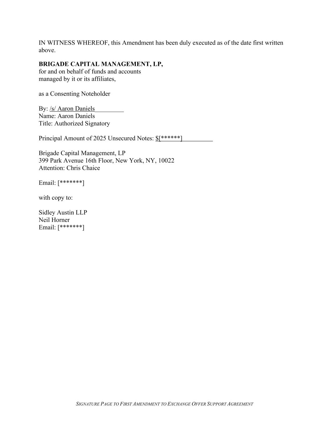 SIGNATURE PAGE TO FIRST AMENDMENT TO EXCHANGE OFFER SUPPORT AGREEMENT IN WITNESS WHEREOF, this Amendment has been duly executed as of the date first written above. BRIGADE CAPITAL MANAGEMENT, LP, for and on behalf of funds and accounts managed by it or its affiliates, as a Consenting Noteholder By: /s/ Aaron Daniels_________ Name: Aaron Daniels Title: Authorized Signatory Principal Amount of 2025 Unsecured Notes: $[******] Brigade Capital Management, LP 399 Park Avenue 16th Floor, New York, NY, 10022 Attention: Chris Chaice Email: [*******] with copy to: Sidley Austin LLP Neil Horner Email: [*******]