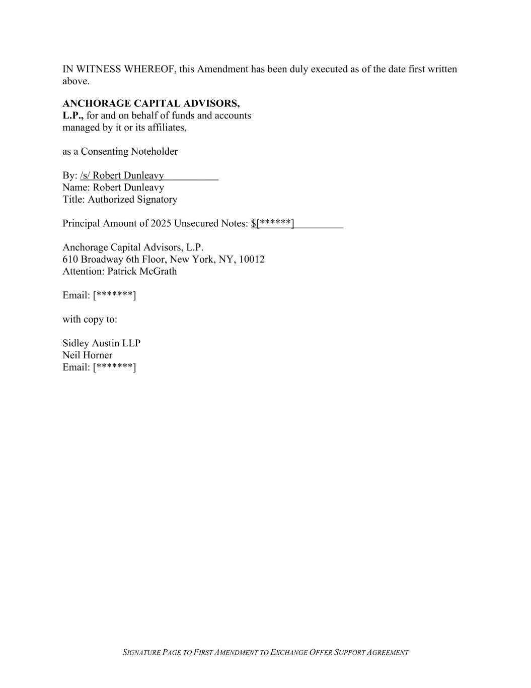 SIGNATURE PAGE TO FIRST AMENDMENT TO EXCHANGE OFFER SUPPORT AGREEMENT IN WITNESS WHEREOF, this Amendment has been duly executed as of the date first written above. ANCHORAGE CAPITAL ADVISORS, L.P., for and on behalf of funds and accounts managed by it or its affiliates, as a Consenting Noteholder By: /s/ Robert Dunleavy Name: Robert Dunleavy Title: Authorized Signatory Principal Amount of 2025 Unsecured Notes: $[******] Anchorage Capital Advisors, L.P. 610 Broadway 6th Floor, New York, NY, 10012 Attention: Patrick McGrath Email: [*******] with copy to: Sidley Austin LLP Neil Horner Email: [*******]