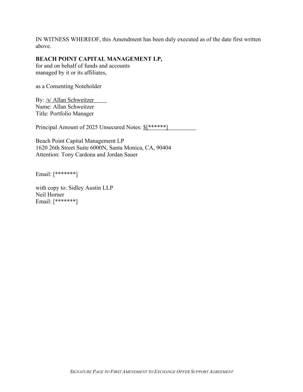 SIGNATURE PAGE TO FIRST AMENDMENT TO EXCHANGE OFFER SUPPORT AGREEMENT IN WITNESS WHEREOF, this Amendment has been duly executed as of the date first written above. BEACH POINT CAPITAL MANAGEMENT LP, for and on behalf of funds and accounts managed by it or its affiliates, as a Consenting Noteholder By: /s/ Allan Schweitzer Name: Allan Schweitzer Title: Portfolio Manager Principal Amount of 2025 Unsecured Notes: $[******] Beach Point Capital Management LP 1620 26th Street Suite 6000N, Santa Monica, CA, 90404 Attention: Tony Cardona and Jordan Sauer Email: [*******] with copy to: Sidley Austin LLP Neil Horner Email: [*******]