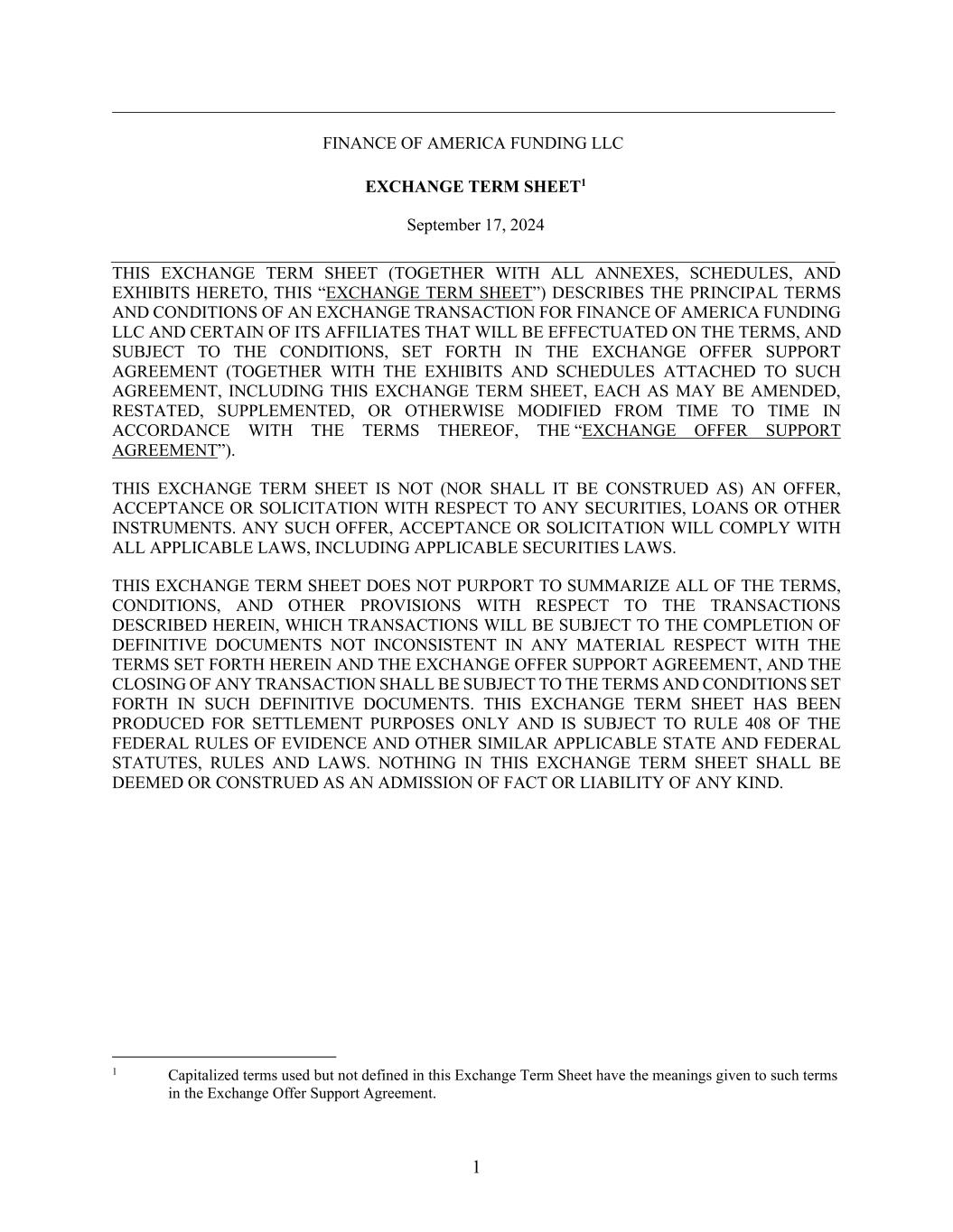 1 FINANCE OF AMERICA FUNDING LLC EXCHANGE TERM SHEET1 September 17, 2024 THIS EXCHANGE TERM SHEET (TOGETHER WITH ALL ANNEXES, SCHEDULES, AND EXHIBITS HERETO, THIS “EXCHANGE TERM SHEET”) DESCRIBES THE PRINCIPAL TERMS AND CONDITIONS OF AN EXCHANGE TRANSACTION FOR FINANCE OF AMERICA FUNDING LLC AND CERTAIN OF ITS AFFILIATES THAT WILL BE EFFECTUATED ON THE TERMS, AND SUBJECT TO THE CONDITIONS, SET FORTH IN THE EXCHANGE OFFER SUPPORT AGREEMENT (TOGETHER WITH THE EXHIBITS AND SCHEDULES ATTACHED TO SUCH AGREEMENT, INCLUDING THIS EXCHANGE TERM SHEET, EACH AS MAY BE AMENDED, RESTATED, SUPPLEMENTED, OR OTHERWISE MODIFIED FROM TIME TO TIME IN ACCORDANCE WITH THE TERMS THEREOF, THE “EXCHANGE OFFER SUPPORT AGREEMENT”). THIS EXCHANGE TERM SHEET IS NOT (NOR SHALL IT BE CONSTRUED AS) AN OFFER, ACCEPTANCE OR SOLICITATION WITH RESPECT TO ANY SECURITIES, LOANS OR OTHER INSTRUMENTS. ANY SUCH OFFER, ACCEPTANCE OR SOLICITATION WILL COMPLY WITH ALL APPLICABLE LAWS, INCLUDING APPLICABLE SECURITIES LAWS. THIS EXCHANGE TERM SHEET DOES NOT PURPORT TO SUMMARIZE ALL OF THE TERMS, CONDITIONS, AND OTHER PROVISIONS WITH RESPECT TO THE TRANSACTIONS DESCRIBED HEREIN, WHICH TRANSACTIONS WILL BE SUBJECT TO THE COMPLETION OF DEFINITIVE DOCUMENTS NOT INCONSISTENT IN ANY MATERIAL RESPECT WITH THE TERMS SET FORTH HEREIN AND THE EXCHANGE OFFER SUPPORT AGREEMENT, AND THE CLOSING OF ANY TRANSACTION SHALL BE SUBJECT TO THE TERMS AND CONDITIONS SET FORTH IN SUCH DEFINITIVE DOCUMENTS. THIS EXCHANGE TERM SHEET HAS BEEN PRODUCED FOR SETTLEMENT PURPOSES ONLY AND IS SUBJECT TO RULE 408 OF THE FEDERAL RULES OF EVIDENCE AND OTHER SIMILAR APPLICABLE STATE AND FEDERAL STATUTES, RULES AND LAWS. NOTHING IN THIS EXCHANGE TERM SHEET SHALL BE DEEMED OR CONSTRUED AS AN ADMISSION OF FACT OR LIABILITY OF ANY KIND. 1 Capitalized terms used but not defined in this Exchange Term Sheet have the meanings given to such terms in the Exchange Offer Support Agreement.