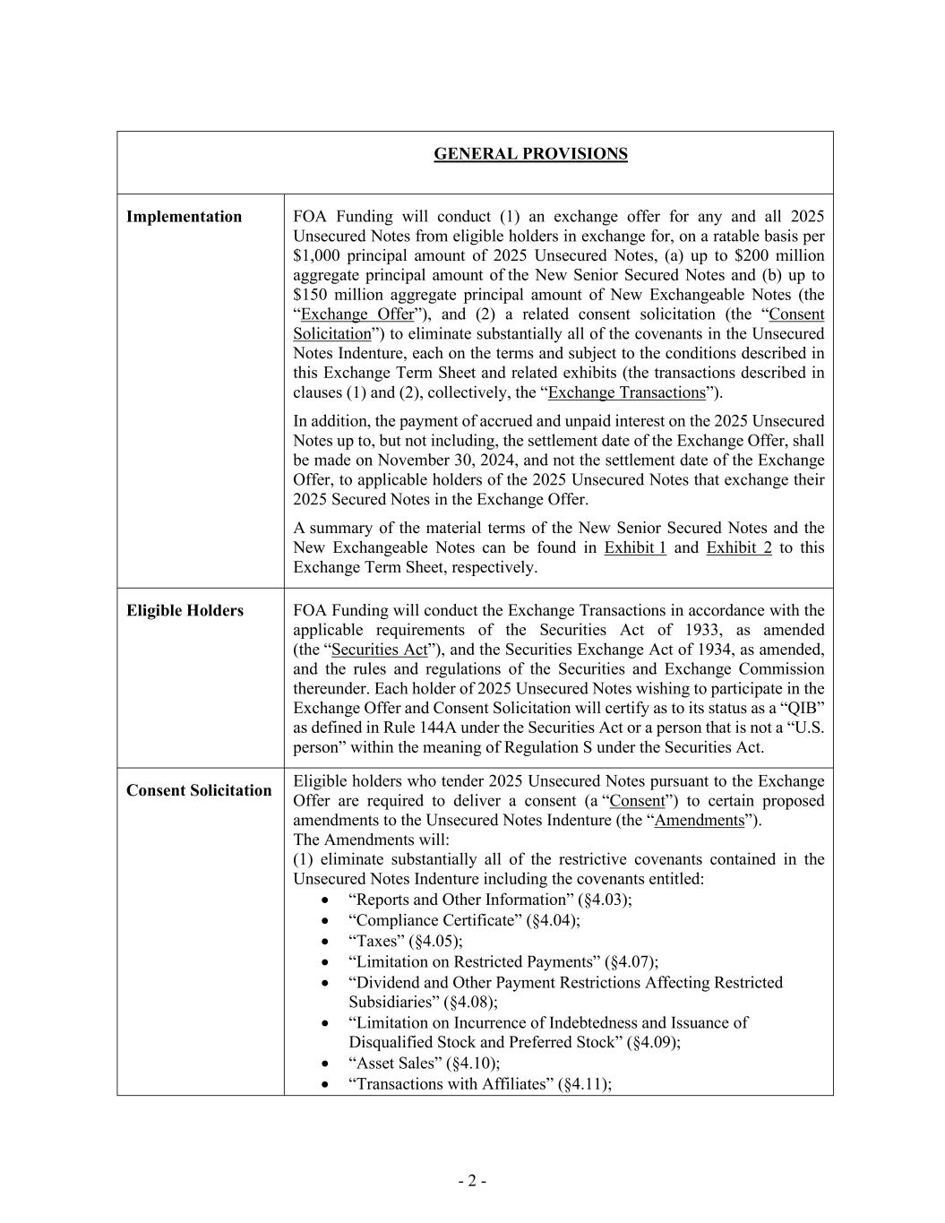 - 2 - GENERAL PROVISIONS Implementation FOA Funding will conduct (1) an exchange offer for any and all 2025 Unsecured Notes from eligible holders in exchange for, on a ratable basis per $1,000 principal amount of 2025 Unsecured Notes, (a) up to $200 million aggregate principal amount of the New Senior Secured Notes and (b) up to $150 million aggregate principal amount of New Exchangeable Notes (the “Exchange Offer”), and (2) a related consent solicitation (the “Consent Solicitation”) to eliminate substantially all of the covenants in the Unsecured Notes Indenture, each on the terms and subject to the conditions described in this Exchange Term Sheet and related exhibits (the transactions described in clauses (1) and (2), collectively, the “Exchange Transactions”). In addition, the payment of accrued and unpaid interest on the 2025 Unsecured Notes up to, but not including, the settlement date of the Exchange Offer, shall be made on November 30, 2024, and not the settlement date of the Exchange Offer, to applicable holders of the 2025 Unsecured Notes that exchange their 2025 Secured Notes in the Exchange Offer. A summary of the material terms of the New Senior Secured Notes and the New Exchangeable Notes can be found in Exhibit 1 and Exhibit 2 to this Exchange Term Sheet, respectively. Eligible Holders FOA Funding will conduct the Exchange Transactions in accordance with the applicable requirements of the Securities Act of 1933, as amended (the “Securities Act”), and the Securities Exchange Act of 1934, as amended, and the rules and regulations of the Securities and Exchange Commission thereunder. Each holder of 2025 Unsecured Notes wishing to participate in the Exchange Offer and Consent Solicitation will certify as to its status as a “QIB” as defined in Rule 144A under the Securities Act or a person that is not a “U.S. person” within the meaning of Regulation S under the Securities Act. Consent Solicitation Eligible holders who tender 2025 Unsecured Notes pursuant to the Exchange Offer are required to deliver a consent (a “Consent”) to certain proposed amendments to the Unsecured Notes Indenture (the “Amendments”). The Amendments will: (1) eliminate substantially all of the restrictive covenants contained in the Unsecured Notes Indenture including the covenants entitled: • “Reports and Other Information” (§4.03); • “Compliance Certificate” (§4.04); • “Taxes” (§4.05); • “Limitation on Restricted Payments” (§4.07); • “Dividend and Other Payment Restrictions Affecting Restricted Subsidiaries” (§4.08); • “Limitation on Incurrence of Indebtedness and Issuance of Disqualified Stock and Preferred Stock” (§4.09); • “Asset Sales” (§4.10); • “Transactions with Affiliates” (§4.11);