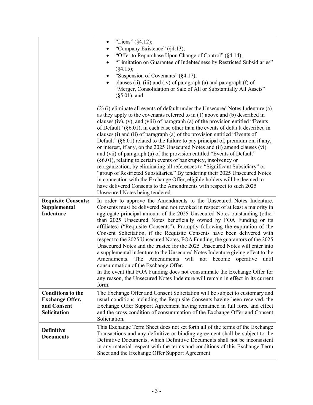 - 3 - • “Liens” (§4.12); • “Company Existence” (§4.13); • “Offer to Repurchase Upon Change of Control” (§4.14); • “Limitation on Guarantee of Indebtedness by Restricted Subsidiaries” (§4.15); • “Suspension of Covenants” (§4.17); • clauses (ii), (iii) and (iv) of paragraph (a) and paragraph (f) of “Merger, Consolidation or Sale of All or Substantially All Assets” (§5.01); and (2) (i) eliminate all events of default under the Unsecured Notes Indenture (a) as they apply to the covenants referred to in (1) above and (b) described in clauses (iv), (v), and (viii) of paragraph (a) of the provision entitled “Events of Default” (§6.01), in each case other than the events of default described in clauses (i) and (ii) of paragraph (a) of the provision entitled “Events of Default” (§6.01) related to the failure to pay principal of, premium on, if any, or interest, if any, on the 2025 Unsecured Notes and (ii) amend clauses (vi) and (vii) of paragraph (a) of the provision entitled “Events of Default” (§6.01), relating to certain events of bankruptcy, insolvency or reorganization, by eliminating all references to “Significant Subsidiary” or “group of Restricted Subsidiaries.” By tendering their 2025 Unsecured Notes in connection with the Exchange Offer, eligible holders will be deemed to have delivered Consents to the Amendments with respect to such 2025 Unsecured Notes being tendered. Requisite Consents; Supplemental Indenture In order to approve the Amendments to the Unsecured Notes Indenture, Consents must be delivered and not revoked in respect of at least a majority in aggregate principal amount of the 2025 Unsecured Notes outstanding (other than 2025 Unsecured Notes beneficially owned by FOA Funding or its affiliates) (“Requisite Consents”). Promptly following the expiration of the Consent Solicitation, if the Requisite Consents have been delivered with respect to the 2025 Unsecured Notes, FOA Funding, the guarantors of the 2025 Unsecured Notes and the trustee for the 2025 Unsecured Notes will enter into a supplemental indenture to the Unsecured Notes Indenture giving effect to the Amendments. The Amendments will not become operative until consummation of the Exchange Offer. In the event that FOA Funding does not consummate the Exchange Offer for any reason, the Unsecured Notes Indenture will remain in effect in its current form. Conditions to the Exchange Offer, and Consent Solicitation The Exchange Offer and Consent Solicitation will be subject to customary and usual conditions including the Requisite Consents having been received, the Exchange Offer Support Agreement having remained in full force and effect and the cross condition of consummation of the Exchange Offer and Consent Solicitation. Definitive Documents This Exchange Term Sheet does not set forth all of the terms of the Exchange Transactions and any definitive or binding agreement shall be subject to the Definitive Documents, which Definitive Documents shall not be inconsistent in any material respect with the terms and conditions of this Exchange Term Sheet and the Exchange Offer Support Agreement.