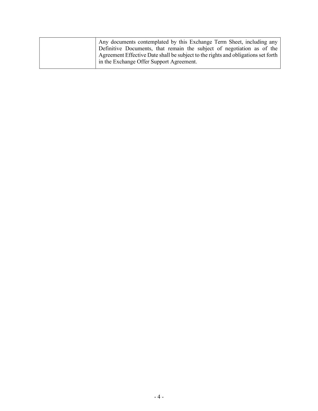 - 4 - Any documents contemplated by this Exchange Term Sheet, including any Definitive Documents, that remain the subject of negotiation as of the Agreement Effective Date shall be subject to the rights and obligations set forth in the Exchange Offer Support Agreement.