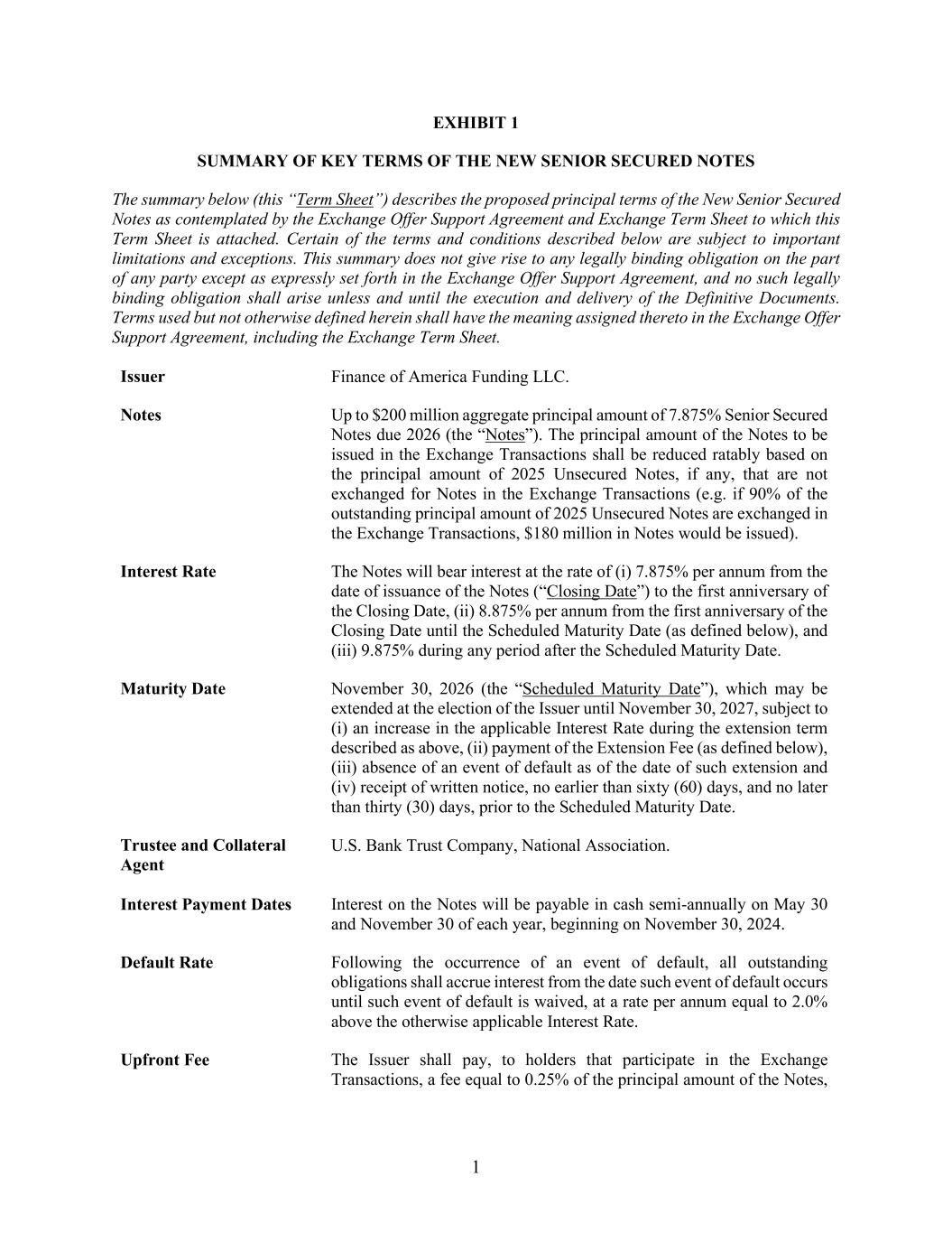 1 EXHIBIT 1 SUMMARY OF KEY TERMS OF THE NEW SENIOR SECURED NOTES The summary below (this “Term Sheet”) describes the proposed principal terms of the New Senior Secured Notes as contemplated by the Exchange Offer Support Agreement and Exchange Term Sheet to which this Term Sheet is attached. Certain of the terms and conditions described below are subject to important limitations and exceptions. This summary does not give rise to any legally binding obligation on the part of any party except as expressly set forth in the Exchange Offer Support Agreement, and no such legally binding obligation shall arise unless and until the execution and delivery of the Definitive Documents. Terms used but not otherwise defined herein shall have the meaning assigned thereto in the Exchange Offer Support Agreement, including the Exchange Term Sheet. Issuer Finance of America Funding LLC. Notes Up to $200 million aggregate principal amount of 7.875% Senior Secured Notes due 2026 (the “Notes”). The principal amount of the Notes to be issued in the Exchange Transactions shall be reduced ratably based on the principal amount of 2025 Unsecured Notes, if any, that are not exchanged for Notes in the Exchange Transactions (e.g. if 90% of the outstanding principal amount of 2025 Unsecured Notes are exchanged in the Exchange Transactions, $180 million in Notes would be issued). Interest Rate The Notes will bear interest at the rate of (i) 7.875% per annum from the date of issuance of the Notes (“Closing Date”) to the first anniversary of the Closing Date, (ii) 8.875% per annum from the first anniversary of the Closing Date until the Scheduled Maturity Date (as defined below), and (iii) 9.875% during any period after the Scheduled Maturity Date. Maturity Date November 30, 2026 (the “Scheduled Maturity Date”), which may be extended at the election of the Issuer until November 30, 2027, subject to (i) an increase in the applicable Interest Rate during the extension term described as above, (ii) payment of the Extension Fee (as defined below), (iii) absence of an event of default as of the date of such extension and (iv) receipt of written notice, no earlier than sixty (60) days, and no later than thirty (30) days, prior to the Scheduled Maturity Date. Trustee and Collateral Agent U.S. Bank Trust Company, National Association. Interest Payment Dates Interest on the Notes will be payable in cash semi-annually on May 30 and November 30 of each year, beginning on November 30, 2024. Default Rate Following the occurrence of an event of default, all outstanding obligations shall accrue interest from the date such event of default occurs until such event of default is waived, at a rate per annum equal to 2.0% above the otherwise applicable Interest Rate. Upfront Fee The Issuer shall pay, to holders that participate in the Exchange Transactions, a fee equal to 0.25% of the principal amount of the Notes,