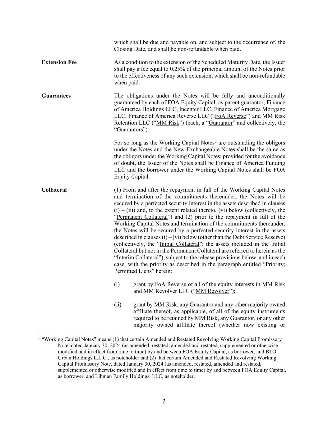 2 which shall be due and payable on, and subject to the occurrence of, the Closing Date, and shall be non-refundable when paid. Extension Fee As a condition to the extension of the Scheduled Maturity Date, the Issuer shall pay a fee equal to 0.25% of the principal amount of the Notes prior to the effectiveness of any such extension, which shall be non-refundable when paid. Guarantees The obligations under the Notes will be fully and unconditionally guaranteed by each of FOA Equity Capital, as parent guarantor, Finance of America Holdings LLC, Incenter LLC, Finance of America Mortgage LLC, Finance of America Reverse LLC (“FoA Reverse”) and MM Risk Retention LLC (“MM Risk”) (each, a “Guarantor” and collectively, the “Guarantors”). For so long as the Working Capital Notes2 are outstanding the obligors under the Notes and the New Exchangeable Notes shall be the same as the obligors under the Working Capital Notes; provided for the avoidance of doubt, the Issuer of the Notes shall be Finance of America Funding LLC and the borrower under the Working Capital Notes shall be FOA Equity Capital. Collateral (1) From and after the repayment in full of the Working Capital Notes and termination of the commitments thereunder, the Notes will be secured by a perfected security interest in the assets described in clauses (i) – (iii) and, to the extent related thereto, (vi) below (collectively, the “Permanent Collateral”) and (2) prior to the repayment in full of the Working Capital Notes and termination of the commitments thereunder, the Notes will be secured by a perfected security interest in the assets described in clauses (i) – (vi) below (other than the Debt Service Reserve) (collectively, the “Initial Collateral”; the assets included in the Initial Collateral but not in the Permanent Collateral are referred to herein as the “Interim Collateral”), subject to the release provisions below, and in each case, with the priority as described in the paragraph entitled “Priority; Permitted Liens” herein: (i) grant by FoA Reverse of all of the equity interests in MM Risk and MM Revolver LLC (“MM Revolver”); (ii) grant by MM Risk, any Guarantor and any other majority owned affiliate thereof, as applicable, of all of the equity instruments required to be retained by MM Risk, any Guarantor, or any other majority owned affiliate thereof (whether now existing or 2 “Working Capital Notes” means (1) that certain Amended and Restated Revolving Working Capital Promissory Note, dated January 30, 2024 (as amended, restated, amended and restated, supplemented or otherwise modified and in effect from time to time) by and between FOA Equity Capital, as borrower, and BTO Urban Holdings L.L.C., as noteholder and (2) that certain Amended and Restated Revolving Working Capital Promissory Note, dated January 30, 2024 (as amended, restated, amended and restated, supplemented or otherwise modified and in effect from time to time) by and between FOA Equity Capital, as borrower, and Libman Family Holdings, LLC, as noteholder.