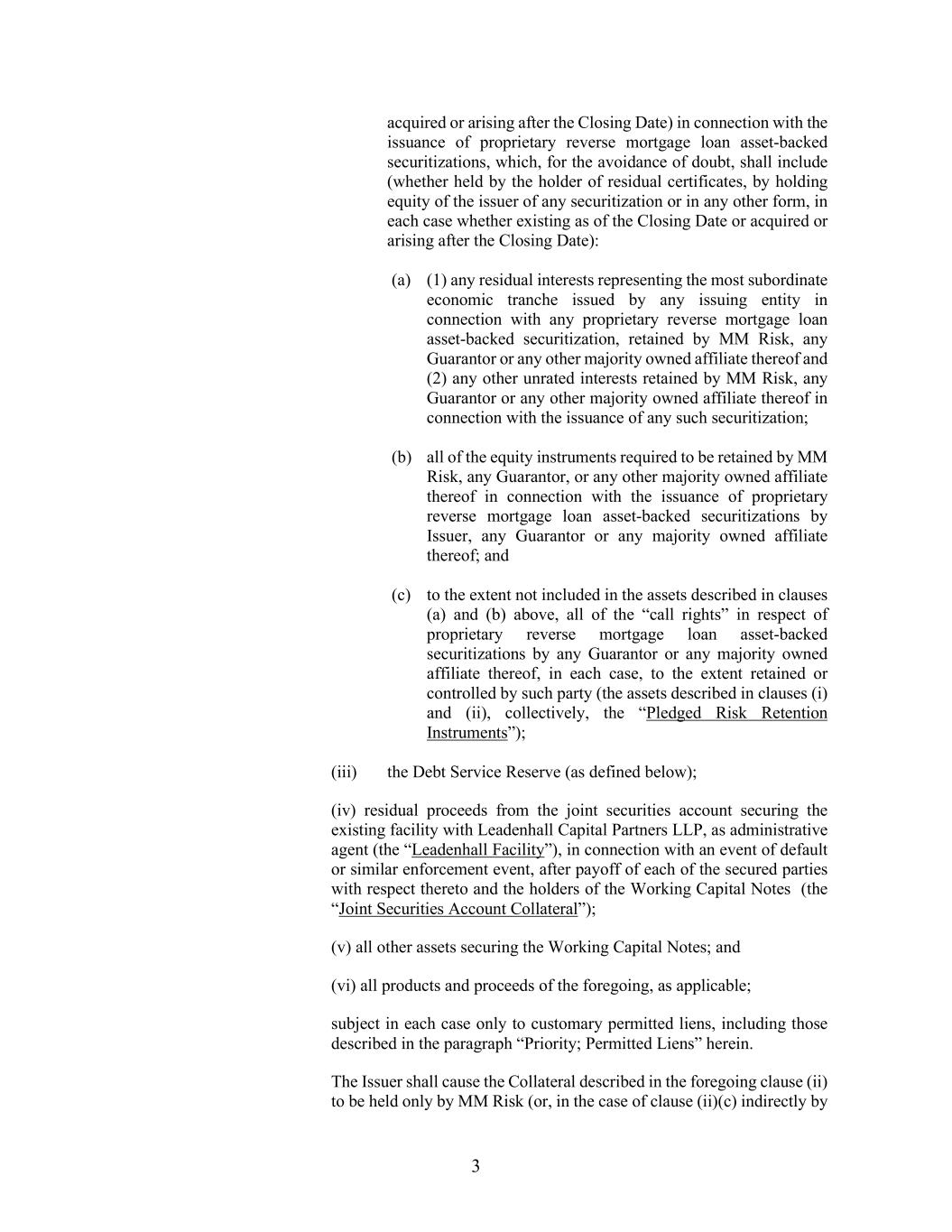 3 acquired or arising after the Closing Date) in connection with the issuance of proprietary reverse mortgage loan asset-backed securitizations, which, for the avoidance of doubt, shall include (whether held by the holder of residual certificates, by holding equity of the issuer of any securitization or in any other form, in each case whether existing as of the Closing Date or acquired or arising after the Closing Date): (a) (1) any residual interests representing the most subordinate economic tranche issued by any issuing entity in connection with any proprietary reverse mortgage loan asset-backed securitization, retained by MM Risk, any Guarantor or any other majority owned affiliate thereof and (2) any other unrated interests retained by MM Risk, any Guarantor or any other majority owned affiliate thereof in connection with the issuance of any such securitization; (b) all of the equity instruments required to be retained by MM Risk, any Guarantor, or any other majority owned affiliate thereof in connection with the issuance of proprietary reverse mortgage loan asset-backed securitizations by Issuer, any Guarantor or any majority owned affiliate thereof; and (c) to the extent not included in the assets described in clauses (a) and (b) above, all of the “call rights” in respect of proprietary reverse mortgage loan asset-backed securitizations by any Guarantor or any majority owned affiliate thereof, in each case, to the extent retained or controlled by such party (the assets described in clauses (i) and (ii), collectively, the “Pledged Risk Retention Instruments”); (iii) the Debt Service Reserve (as defined below); (iv) residual proceeds from the joint securities account securing the existing facility with Leadenhall Capital Partners LLP, as administrative agent (the “Leadenhall Facility”), in connection with an event of default or similar enforcement event, after payoff of each of the secured parties with respect thereto and the holders of the Working Capital Notes (the “Joint Securities Account Collateral”); (v) all other assets securing the Working Capital Notes; and (vi) all products and proceeds of the foregoing, as applicable; subject in each case only to customary permitted liens, including those described in the paragraph “Priority; Permitted Liens” herein. The Issuer shall cause the Collateral described in the foregoing clause (ii) to be held only by MM Risk (or, in the case of clause (ii)(c) indirectly by