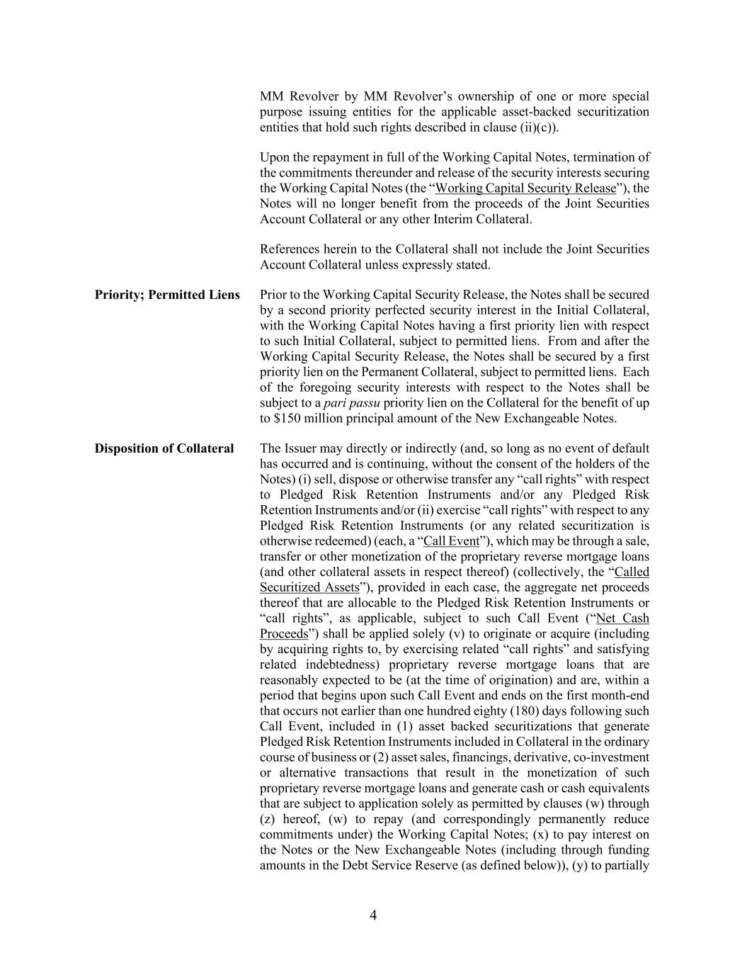 4 MM Revolver by MM Revolver’s ownership of one or more special purpose issuing entities for the applicable asset-backed securitization entities that hold such rights described in clause (ii)(c)). Upon the repayment in full of the Working Capital Notes, termination of the commitments thereunder and release of the security interests securing the Working Capital Notes (the “Working Capital Security Release”), the Notes will no longer benefit from the proceeds of the Joint Securities Account Collateral or any other Interim Collateral. References herein to the Collateral shall not include the Joint Securities Account Collateral unless expressly stated. Priority; Permitted Liens Prior to the Working Capital Security Release, the Notes shall be secured by a second priority perfected security interest in the Initial Collateral, with the Working Capital Notes having a first priority lien with respect to such Initial Collateral, subject to permitted liens. From and after the Working Capital Security Release, the Notes shall be secured by a first priority lien on the Permanent Collateral, subject to permitted liens. Each of the foregoing security interests with respect to the Notes shall be subject to a pari passu priority lien on the Collateral for the benefit of up to $150 million principal amount of the New Exchangeable Notes. Disposition of Collateral The Issuer may directly or indirectly (and, so long as no event of default has occurred and is continuing, without the consent of the holders of the Notes) (i) sell, dispose or otherwise transfer any “call rights” with respect to Pledged Risk Retention Instruments and/or any Pledged Risk Retention Instruments and/or (ii) exercise “call rights” with respect to any Pledged Risk Retention Instruments (or any related securitization is otherwise redeemed) (each, a “Call Event”), which may be through a sale, transfer or other monetization of the proprietary reverse mortgage loans (and other collateral assets in respect thereof) (collectively, the “Called Securitized Assets”), provided in each case, the aggregate net proceeds thereof that are allocable to the Pledged Risk Retention Instruments or “call rights”, as applicable, subject to such Call Event (“Net Cash Proceeds”) shall be applied solely (v) to originate or acquire (including by acquiring rights to, by exercising related “call rights” and satisfying related indebtedness) proprietary reverse mortgage loans that are reasonably expected to be (at the time of origination) and are, within a period that begins upon such Call Event and ends on the first month-end that occurs not earlier than one hundred eighty (180) days following such Call Event, included in (1) asset backed securitizations that generate Pledged Risk Retention Instruments included in Collateral in the ordinary course of business or (2) asset sales, financings, derivative, co-investment or alternative transactions that result in the monetization of such proprietary reverse mortgage loans and generate cash or cash equivalents that are subject to application solely as permitted by clauses (w) through (z) hereof, (w) to repay (and correspondingly permanently reduce commitments under) the Working Capital Notes; (x) to pay interest on the Notes or the New Exchangeable Notes (including through funding amounts in the Debt Service Reserve (as defined below)), (y) to partially