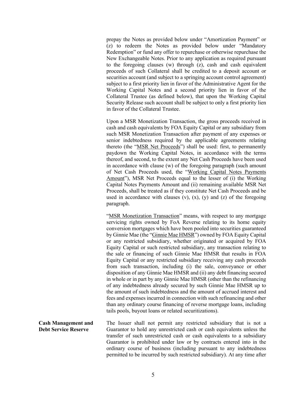 5 prepay the Notes as provided below under “Amortization Payment” or (z) to redeem the Notes as provided below under “Mandatory Redemption” or fund any offer to repurchase or otherwise repurchase the New Exchangeable Notes. Prior to any application as required pursuant to the foregoing clauses (w) through (z), cash and cash equivalent proceeds of such Collateral shall be credited to a deposit account or securities account (and subject to a springing account control agreement) subject to a first priority lien in favor of the Administrative Agent for the Working Capital Notes and a second priority lien in favor of the Collateral Trustee (as defined below), that upon the Working Capital Security Release such account shall be subject to only a first priority lien in favor of the Collateral Trustee. Upon a MSR Monetization Transaction, the gross proceeds received in cash and cash equivalents by FOA Equity Capital or any subsidiary from such MSR Monetization Transaction after payment of any expenses or senior indebtedness required by the applicable agreements relating thereto (the “MSR Net Proceeds”) shall be used: first, to permanently paydown the Working Capital Notes, in accordance with the terms thereof, and second, to the extent any Net Cash Proceeds have been used in accordance with clause (w) of the foregoing paragraph (such amount of Net Cash Proceeds used, the “Working Capital Notes Payments Amount”), MSR Net Proceeds equal to the lesser of (i) the Working Capital Notes Payments Amount and (ii) remaining available MSR Net Proceeds, shall be treated as if they constitute Net Cash Proceeds and be used in accordance with clauses (v), (x), (y) and (z) of the foregoing paragraph. “MSR Monetization Transaction” means, with respect to any mortgage servicing rights owned by FoA Reverse relating to its home equity conversion mortgages which have been pooled into securities guaranteed by Ginnie Mae (the “Ginnie Mae HMSR”) owned by FOA Equity Capital or any restricted subsidiary, whether originated or acquired by FOA Equity Capital or such restricted subsidiary, any transaction relating to the sale or financing of such Ginnie Mae HMSR that results in FOA Equity Capital or any restricted subsidiary receiving any cash proceeds from such transaction, including (i) the sale, conveyance or other disposition of any Ginnie Mae HMSR and (ii) any debt financing secured in whole or in part by any Ginnie Mae HMSR (other than the refinancing of any indebtedness already secured by such Ginnie Mae HMSR up to the amount of such indebtedness and the amount of accrued interest and fees and expenses incurred in connection with such refinancing and other than any ordinary course financing of reverse mortgage loans, including tails pools, buyout loans or related securitizations). Cash Management and Debt Service Reserve The Issuer shall not permit any restricted subsidiary that is not a Guarantor to hold any unrestricted cash or cash equivalents unless the transfer of such unrestricted cash or cash equivalents to a subsidiary Guarantor is prohibited under law or by contracts entered into in the ordinary course of business (including pursuant to any indebtedness permitted to be incurred by such restricted subsidiary). At any time after