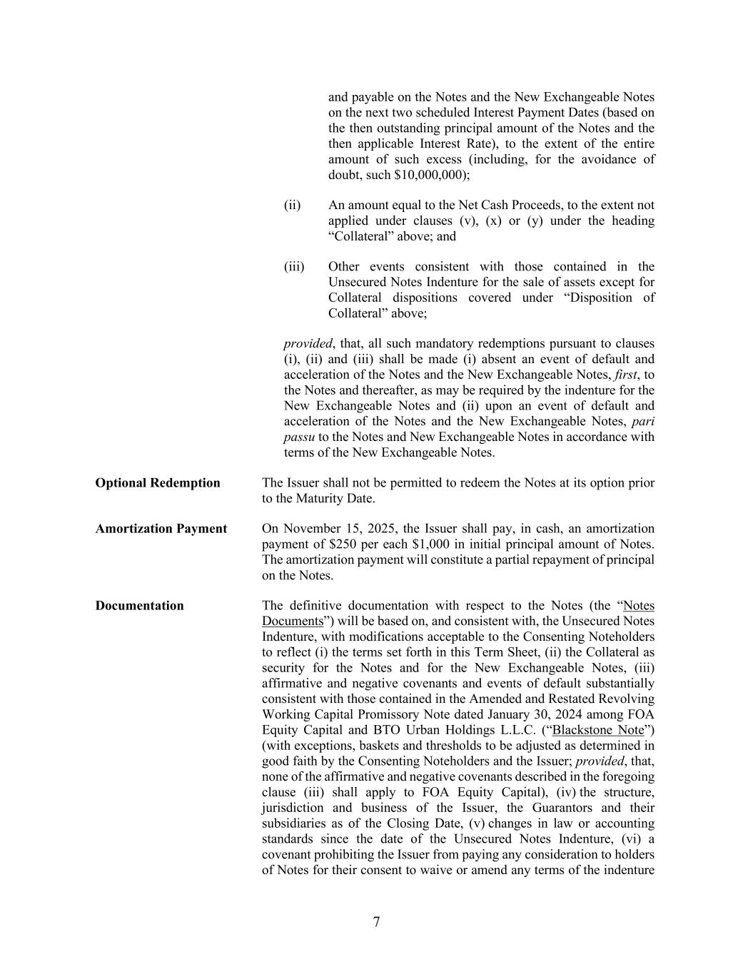 7 and payable on the Notes and the New Exchangeable Notes on the next two scheduled Interest Payment Dates (based on the then outstanding principal amount of the Notes and the then applicable Interest Rate), to the extent of the entire amount of such excess (including, for the avoidance of doubt, such $10,000,000); (ii) An amount equal to the Net Cash Proceeds, to the extent not applied under clauses (v), (x) or (y) under the heading “Collateral” above; and (iii) Other events consistent with those contained in the Unsecured Notes Indenture for the sale of assets except for Collateral dispositions covered under “Disposition of Collateral” above; provided, that, all such mandatory redemptions pursuant to clauses (i), (ii) and (iii) shall be made (i) absent an event of default and acceleration of the Notes and the New Exchangeable Notes, first, to the Notes and thereafter, as may be required by the indenture for the New Exchangeable Notes and (ii) upon an event of default and acceleration of the Notes and the New Exchangeable Notes, pari passu to the Notes and New Exchangeable Notes in accordance with terms of the New Exchangeable Notes. Optional Redemption The Issuer shall not be permitted to redeem the Notes at its option prior to the Maturity Date. Amortization Payment On November 15, 2025, the Issuer shall pay, in cash, an amortization payment of $250 per each $1,000 in initial principal amount of Notes. The amortization payment will constitute a partial repayment of principal on the Notes. Documentation The definitive documentation with respect to the Notes (the “Notes Documents”) will be based on, and consistent with, the Unsecured Notes Indenture, with modifications acceptable to the Consenting Noteholders to reflect (i) the terms set forth in this Term Sheet, (ii) the Collateral as security for the Notes and for the New Exchangeable Notes, (iii) affirmative and negative covenants and events of default substantially consistent with those contained in the Amended and Restated Revolving Working Capital Promissory Note dated January 30, 2024 among FOA Equity Capital and BTO Urban Holdings L.L.C. (“Blackstone Note”) (with exceptions, baskets and thresholds to be adjusted as determined in good faith by the Consenting Noteholders and the Issuer; provided, that, none of the affirmative and negative covenants described in the foregoing clause (iii) shall apply to FOA Equity Capital), (iv) the structure, jurisdiction and business of the Issuer, the Guarantors and their subsidiaries as of the Closing Date, (v) changes in law or accounting standards since the date of the Unsecured Notes Indenture, (vi) a covenant prohibiting the Issuer from paying any consideration to holders of Notes for their consent to waive or amend any terms of the indenture