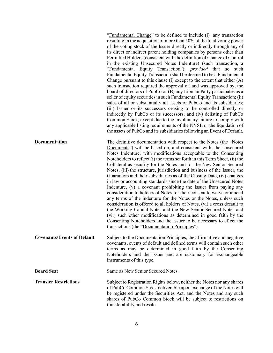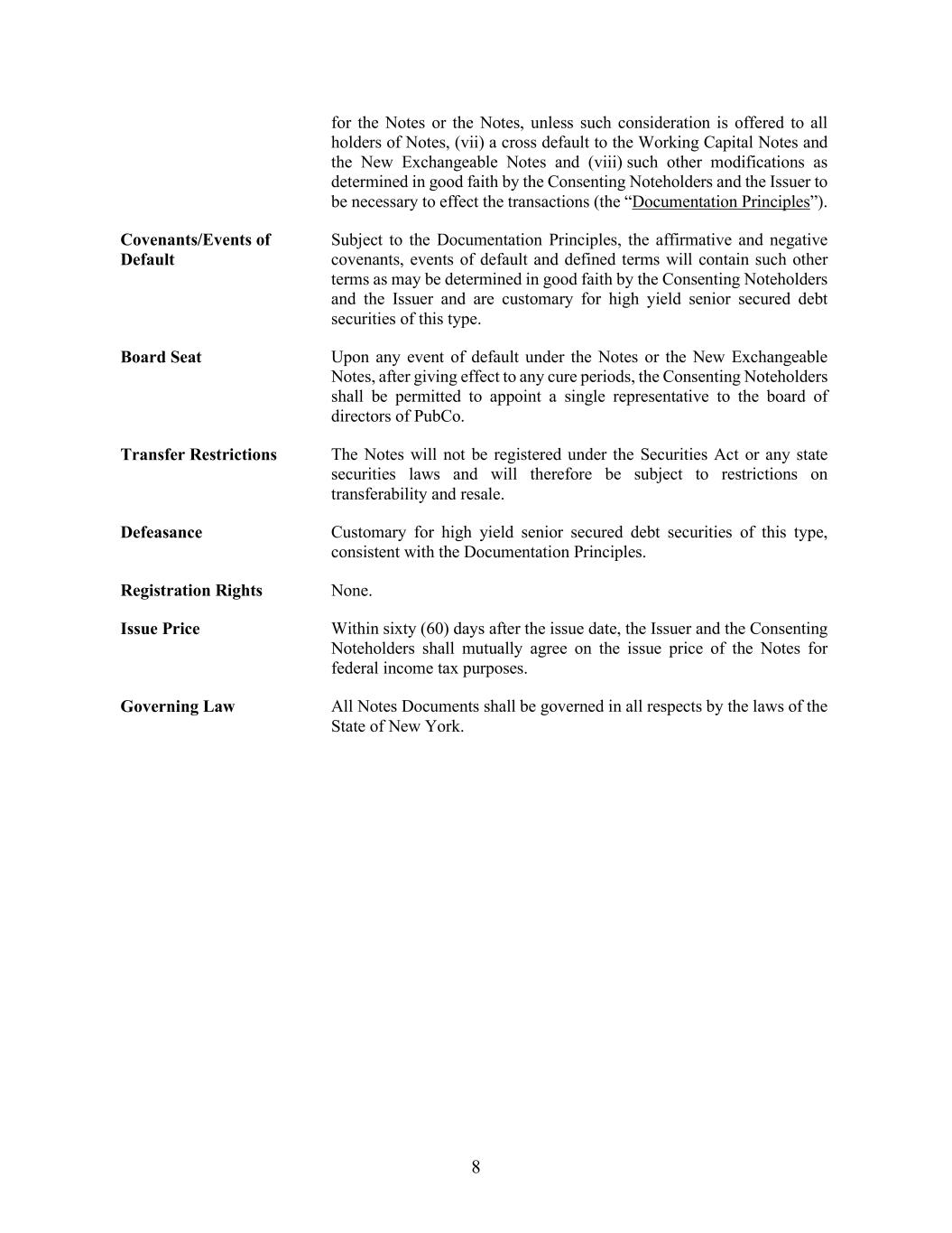 8 for the Notes or the Notes, unless such consideration is offered to all holders of Notes, (vii) a cross default to the Working Capital Notes and the New Exchangeable Notes and (viii) such other modifications as determined in good faith by the Consenting Noteholders and the Issuer to be necessary to effect the transactions (the “Documentation Principles”). Covenants/Events of Default Subject to the Documentation Principles, the affirmative and negative covenants, events of default and defined terms will contain such other terms as may be determined in good faith by the Consenting Noteholders and the Issuer and are customary for high yield senior secured debt securities of this type. Board Seat Upon any event of default under the Notes or the New Exchangeable Notes, after giving effect to any cure periods, the Consenting Noteholders shall be permitted to appoint a single representative to the board of directors of PubCo. Transfer Restrictions The Notes will not be registered under the Securities Act or any state securities laws and will therefore be subject to restrictions on transferability and resale. Defeasance Customary for high yield senior secured debt securities of this type, consistent with the Documentation Principles. Registration Rights None. Issue Price Within sixty (60) days after the issue date, the Issuer and the Consenting Noteholders shall mutually agree on the issue price of the Notes for federal income tax purposes. Governing Law All Notes Documents shall be governed in all respects by the laws of the State of New York.