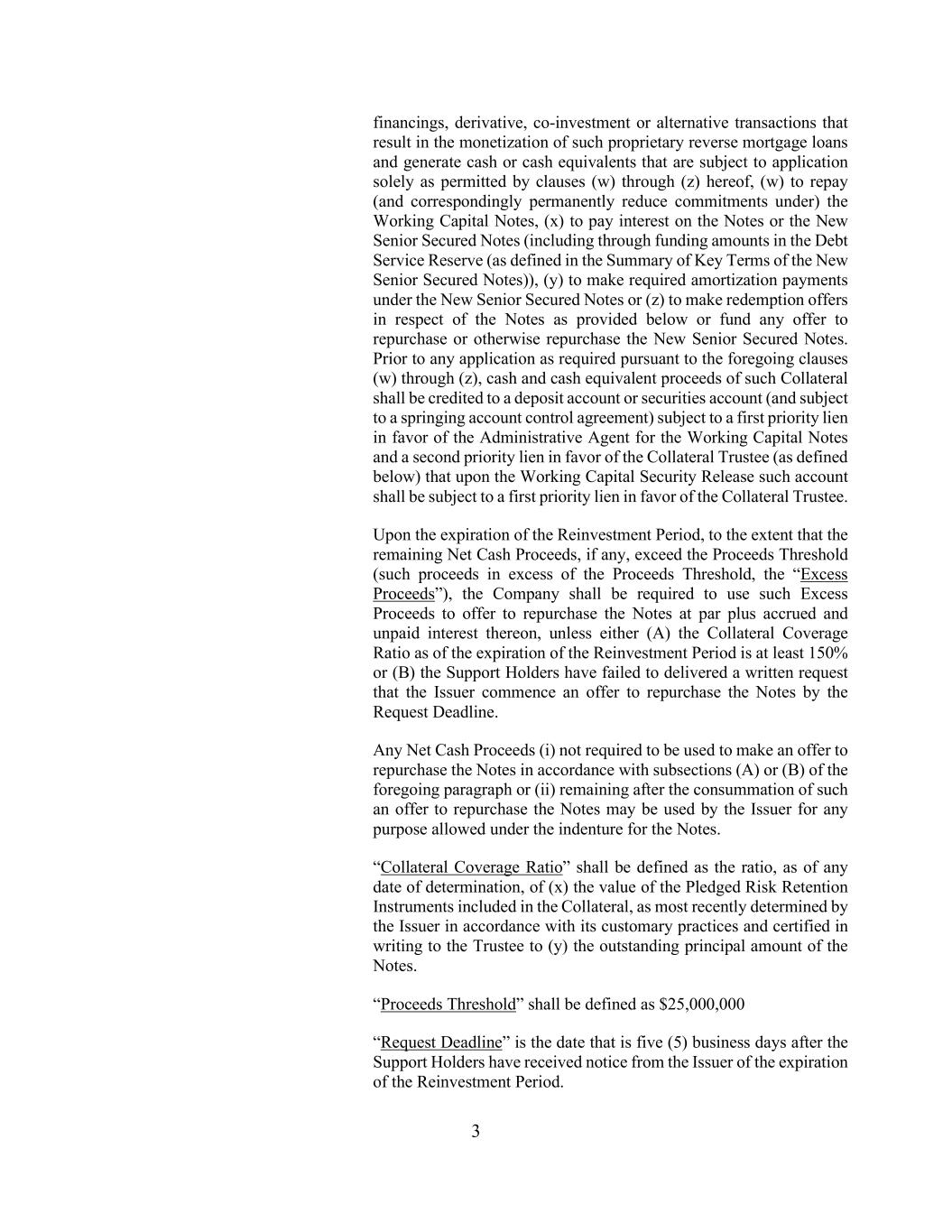 3 financings, derivative, co-investment or alternative transactions that result in the monetization of such proprietary reverse mortgage loans and generate cash or cash equivalents that are subject to application solely as permitted by clauses (w) through (z) hereof, (w) to repay (and correspondingly permanently reduce commitments under) the Working Capital Notes, (x) to pay interest on the Notes or the New Senior Secured Notes (including through funding amounts in the Debt Service Reserve (as defined in the Summary of Key Terms of the New Senior Secured Notes)), (y) to make required amortization payments under the New Senior Secured Notes or (z) to make redemption offers in respect of the Notes as provided below or fund any offer to repurchase or otherwise repurchase the New Senior Secured Notes. Prior to any application as required pursuant to the foregoing clauses (w) through (z), cash and cash equivalent proceeds of such Collateral shall be credited to a deposit account or securities account (and subject to a springing account control agreement) subject to a first priority lien in favor of the Administrative Agent for the Working Capital Notes and a second priority lien in favor of the Collateral Trustee (as defined below) that upon the Working Capital Security Release such account shall be subject to a first priority lien in favor of the Collateral Trustee. Upon the expiration of the Reinvestment Period, to the extent that the remaining Net Cash Proceeds, if any, exceed the Proceeds Threshold (such proceeds in excess of the Proceeds Threshold, the “Excess Proceeds”), the Company shall be required to use such Excess Proceeds to offer to repurchase the Notes at par plus accrued and unpaid interest thereon, unless either (A) the Collateral Coverage Ratio as of the expiration of the Reinvestment Period is at least 150% or (B) the Support Holders have failed to delivered a written request that the Issuer commence an offer to repurchase the Notes by the Request Deadline. Any Net Cash Proceeds (i) not required to be used to make an offer to repurchase the Notes in accordance with subsections (A) or (B) of the foregoing paragraph or (ii) remaining after the consummation of such an offer to repurchase the Notes may be used by the Issuer for any purpose allowed under the indenture for the Notes. “Collateral Coverage Ratio” shall be defined as the ratio, as of any date of determination, of (x) the value of the Pledged Risk Retention Instruments included in the Collateral, as most recently determined by the Issuer in accordance with its customary practices and certified in writing to the Trustee to (y) the outstanding principal amount of the Notes. “Proceeds Threshold” shall be defined as $25,000,000 “Request Deadline” is the date that is five (5) business days after the Support Holders have received notice from the Issuer of the expiration of the Reinvestment Period.