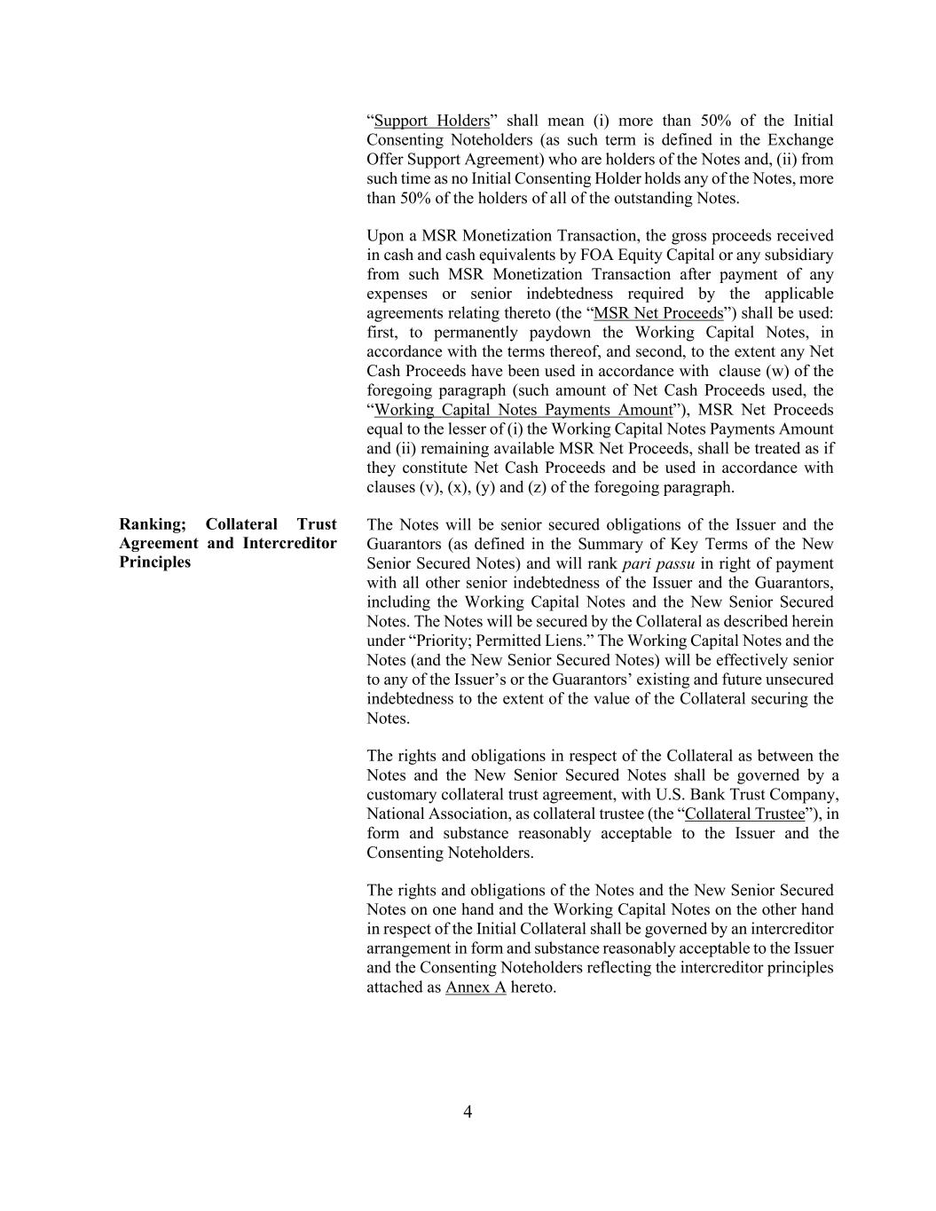 4 “Support Holders” shall mean (i) more than 50% of the Initial Consenting Noteholders (as such term is defined in the Exchange Offer Support Agreement) who are holders of the Notes and, (ii) from such time as no Initial Consenting Holder holds any of the Notes, more than 50% of the holders of all of the outstanding Notes. Upon a MSR Monetization Transaction, the gross proceeds received in cash and cash equivalents by FOA Equity Capital or any subsidiary from such MSR Monetization Transaction after payment of any expenses or senior indebtedness required by the applicable agreements relating thereto (the “MSR Net Proceeds”) shall be used: first, to permanently paydown the Working Capital Notes, in accordance with the terms thereof, and second, to the extent any Net Cash Proceeds have been used in accordance with clause (w) of the foregoing paragraph (such amount of Net Cash Proceeds used, the “Working Capital Notes Payments Amount”), MSR Net Proceeds equal to the lesser of (i) the Working Capital Notes Payments Amount and (ii) remaining available MSR Net Proceeds, shall be treated as if they constitute Net Cash Proceeds and be used in accordance with clauses (v), (x), (y) and (z) of the foregoing paragraph. Ranking; Collateral Trust Agreement and Intercreditor Principles The Notes will be senior secured obligations of the Issuer and the Guarantors (as defined in the Summary of Key Terms of the New Senior Secured Notes) and will rank pari passu in right of payment with all other senior indebtedness of the Issuer and the Guarantors, including the Working Capital Notes and the New Senior Secured Notes. The Notes will be secured by the Collateral as described herein under “Priority; Permitted Liens.” The Working Capital Notes and the Notes (and the New Senior Secured Notes) will be effectively senior to any of the Issuer’s or the Guarantors’ existing and future unsecured indebtedness to the extent of the value of the Collateral securing the Notes. The rights and obligations in respect of the Collateral as between the Notes and the New Senior Secured Notes shall be governed by a customary collateral trust agreement, with U.S. Bank Trust Company, National Association, as collateral trustee (the “Collateral Trustee”), in form and substance reasonably acceptable to the Issuer and the Consenting Noteholders. The rights and obligations of the Notes and the New Senior Secured Notes on one hand and the Working Capital Notes on the other hand in respect of the Initial Collateral shall be governed by an intercreditor arrangement in form and substance reasonably acceptable to the Issuer and the Consenting Noteholders reflecting the intercreditor principles attached as Annex A hereto.