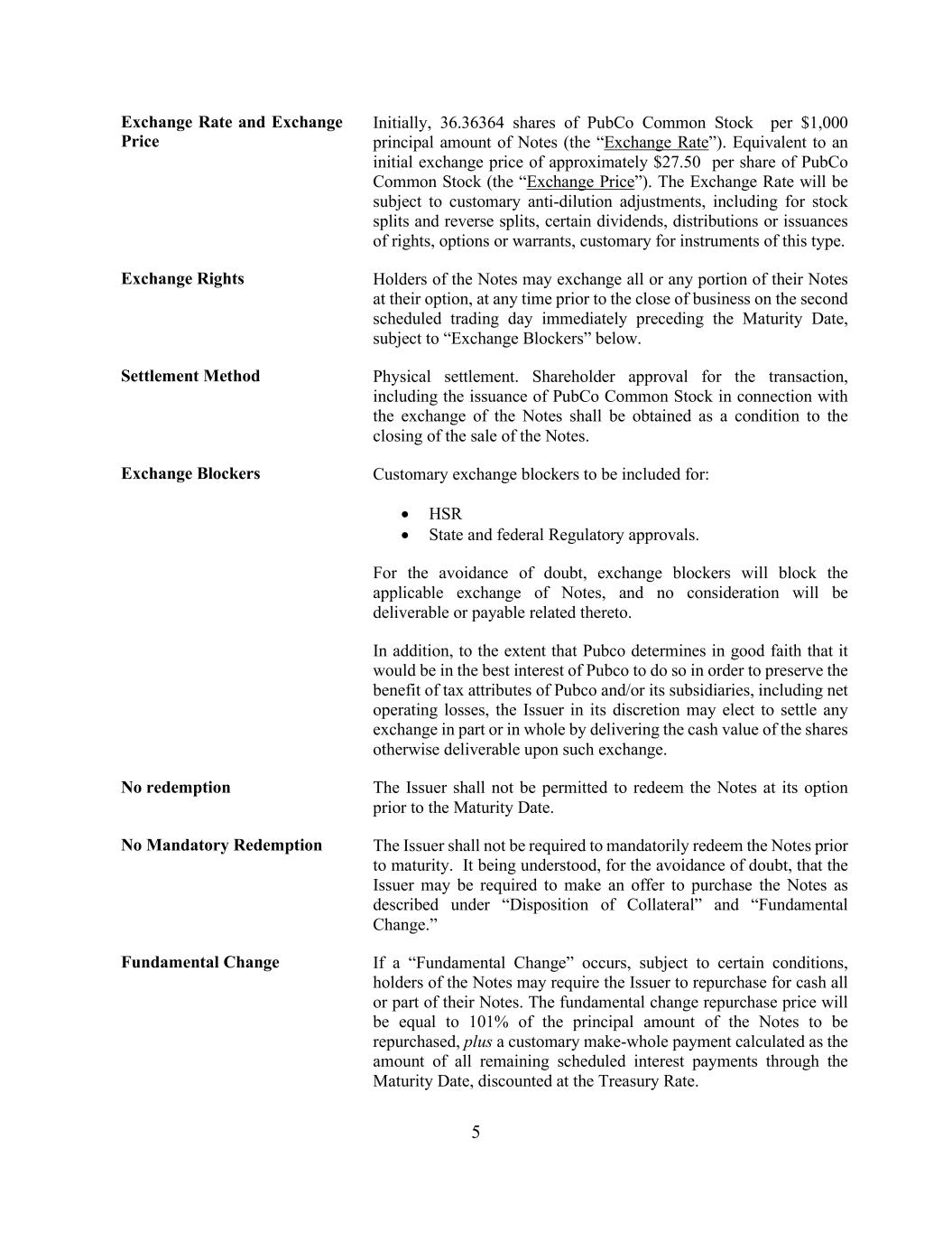 5 Exchange Rate and Exchange Price Initially, 36.36364 shares of PubCo Common Stock per $1,000 principal amount of Notes (the “Exchange Rate”). Equivalent to an initial exchange price of approximately $27.50 per share of PubCo Common Stock (the “Exchange Price”). The Exchange Rate will be subject to customary anti-dilution adjustments, including for stock splits and reverse splits, certain dividends, distributions or issuances of rights, options or warrants, customary for instruments of this type. Exchange Rights Holders of the Notes may exchange all or any portion of their Notes at their option, at any time prior to the close of business on the second scheduled trading day immediately preceding the Maturity Date, subject to “Exchange Blockers” below. Settlement Method Physical settlement. Shareholder approval for the transaction, including the issuance of PubCo Common Stock in connection with the exchange of the Notes shall be obtained as a condition to the closing of the sale of the Notes. Exchange Blockers Customary exchange blockers to be included for: • HSR • State and federal Regulatory approvals. For the avoidance of doubt, exchange blockers will block the applicable exchange of Notes, and no consideration will be deliverable or payable related thereto. In addition, to the extent that Pubco determines in good faith that it would be in the best interest of Pubco to do so in order to preserve the benefit of tax attributes of Pubco and/or its subsidiaries, including net operating losses, the Issuer in its discretion may elect to settle any exchange in part or in whole by delivering the cash value of the shares otherwise deliverable upon such exchange. No redemption The Issuer shall not be permitted to redeem the Notes at its option prior to the Maturity Date. No Mandatory Redemption The Issuer shall not be required to mandatorily redeem the Notes prior to maturity. It being understood, for the avoidance of doubt, that the Issuer may be required to make an offer to purchase the Notes as described under “Disposition of Collateral” and “Fundamental Change.” Fundamental Change If a “Fundamental Change” occurs, subject to certain conditions, holders of the Notes may require the Issuer to repurchase for cash all or part of their Notes. The fundamental change repurchase price will be equal to 101% of the principal amount of the Notes to be repurchased, plus a customary make-whole payment calculated as the amount of all remaining scheduled interest payments through the Maturity Date, discounted at the Treasury Rate.
