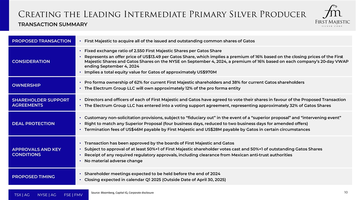 TRANSACTION HIGHLIGHTS Consolidates three world-class, producing silver mining districts in Mexico under one banner 1 • Cerro Los Gatos (CLG), San Dimas and Santa Elena collectively provide the foundation of a diversified, intermediate primary silver producer Enhances production profile with strong margins 2 (1) • Combined annual production of 30-32 Moz AgEq, including 15-16 Moz Ag at all-in sustaining costs of US$18.00-US$20.00/oz AgEq Bolsters free cash flow generation 3 (2) • Gatos expected to immediately contribute annual free cash flow of ~US$70M to the combined entity Leverages a highly experienced combined team with a strong track record of value creation in Mexico 4 • Over 20 years of experience operating in Mexico, with an emphasis on socially responsible mining, community engagement and value creation Maintains peer-leading exposure to silver 5 (3) • Over 50% of pro forma revenue derived from silver compared to an average of ~30% for intermediate silver producing peers Creates a 350,000 ha highly prospective land package which has yielded a history of exploration success 6 • Cerro Los Gatos contributes 103,000 ha of unencumbered and underexplored land with significant new discovery potential Results in a larger company with a strengthened balance sheet, leading trading liquidity and improved capital markets profile 7 • Pro forma market cap approaching US$3B, average daily trading liquidity of ~US$49M, and well-positioned to deliver increased shareholder value Realizes meaningful synergies 8• Corporate cost savings, supply chain and procurement efficiencies, cross-pollination of expertise, and acceleration/optimization of internal projects and exploration programs all expected to deliver meaningful value creation for all shareholders Source: Capital IQ, Corporate disclosure (1) Based on First Majestic and Gatos 2024 production guidance, adjusted for First Majestic metal price assumptions and shown on an attributable basis. All-in-sustaining costs or “AISC” are non-GAAP (2) measures. For further information regarding such measures please refer to each companies’ respective separate public disclosure. Based on analyst consensus estimates for 2024. Free cash flow is a non- 9 (3) GAAP measure. For further information regarding such measure please refer to each companies’ respective separate public disclosure. Based on mid-point of silver production guidance divided by silver TSX | AG NYSE | AG FSE | FMV equivalent production guidance.