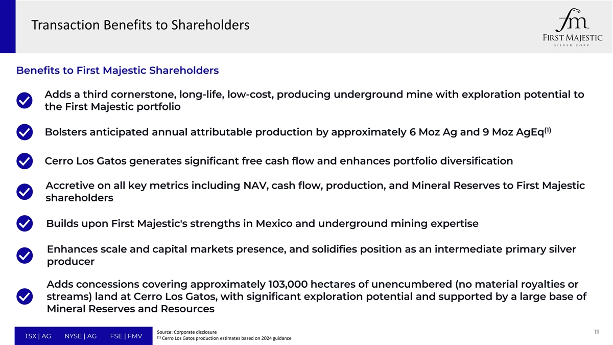 TRANSACTION SUMMARY PROPOSED TRANSACTION• First Majestic to acquire all of the issued and outstanding common shares of Gatos • Fixed exchange ratio of 2.550 First Majestic Shares per Gatos Share • Represents an offer price of US$13.49 per Gatos Share, which implies a premium of 16% based on the closing prices of the First CONSIDERATION Majestic Shares and Gatos Shares on the NYSE on September 4, 2024, a premium of 16% based on each company’s 20-day VWAP ending September 4, 2024 • Implies a total equity value for Gatos of approximately US$970M • Pro forma ownership of 62% for current First Majestic shareholders and 38% for current Gatos shareholders OWNERSHIP • The Electrum Group LLC will own approximately 12% of the pro forma entity • Directors and officers of each of First Majestic and Gatos have agreed to vote their shares in favour of the Proposed Transaction SHAREHOLDER SUPPORT AGREEMENTS • The Electrum Group LLC has entered into a voting support agreement, representing approximately 32% of Gatos Shares • Customary non-solicitation provisions, subject to “fiduciary out” in the event of a “superior proposal” and “intervening event” DEAL PROTECTION• Right to match any Superior Proposal (four business days, reduced to two business days for amended offers) • Termination fees of US$46M payable by First Majestic and US$28M payable by Gatos in certain circumstances • Transaction has been approved by the boards of First Majestic and Gatos • Subject to approval of at least 50%+1 of First Majestic shareholder votes cast and 50%+1 of outstanding Gatos Shares APPROVALS AND KEY CONDITIONS • Receipt of any required regulatory approvals, including clearance from Mexican anti-trust authorities • No material adverse change • Shareholder meetings expected to be held before the end of 2024 PROPOSED TIMING • Closing expected in calendar Q1 2025 (Outside Date of April 30, 2025) 10 Source: Bloomberg, Capital IQ, Corporate disclosure TSX | AG NYSE | AG FSE | FMV