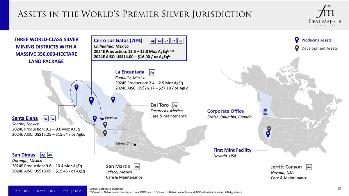 Transaction Benefits to Shareholders Benefits to First Majestic Shareholders Adds a third cornerstone, long-life, low-cost, producing underground mine with exploration potential to the First Majestic portfolio (1) Bolsters anticipated annual attributable production by approximately 6 Moz Ag and 9 Moz AgEq Cerro Los Gatos generates significant free cash flow and enhances portfolio diversification Accretive on all key metrics including NAV, cash flow, production, and Mineral Reserves to First Majestic shareholders Builds upon First Majestic's strengths in Mexico and underground mining expertise Enhances scale and capital markets presence, and solidifies position as an intermediate primary silver producer Adds concessions covering approximately 103,000 hectares of unencumbered (no material royalties or streams) land at Cerro Los Gatos, with significant exploration potential and supported by a large base of Mineral Reserves and Resources 11 Source: Corporate disclosure TSX | AG NYSE | AG FSE | FMV (1) Cerro Los Gatos production estimates based on 2024 guidance