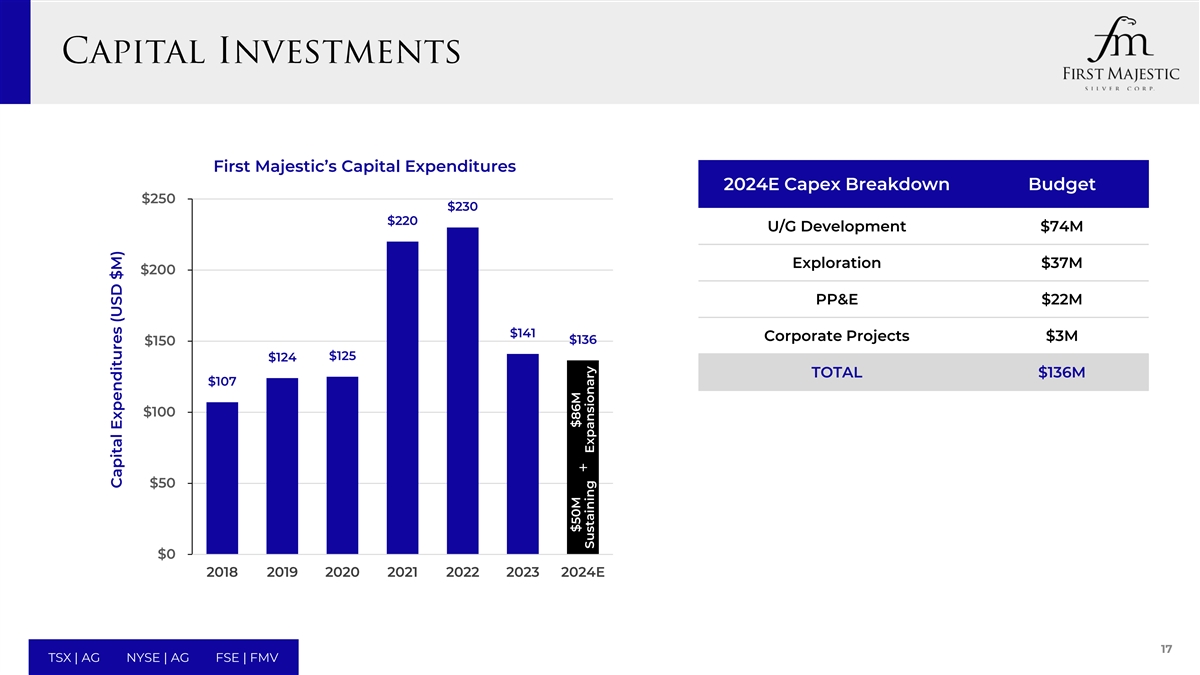 Silver Oz (M) Gold Oz (k) Silver Eqv Oz (M) Cash Cost AISC Silver Operations: ($ per AgEq oz) ($ per AgEq oz) Santa Elena, Mexico 1.3 – 1.4 94 – 99 9.2 – 9.6 12.45 – 12.73 15.25 – 15.64 San Dimas, Mexico 5.2 – 5.5 56 – 59 9.8 – 10.4 14.17– 14.69 18.69 – 19.45 La Encantada, Mexico 2.4 – 2.5 – 2.4 – 2.5 21.52 – 22.26 26.17 – 27.18 Operations Total: 8.9 – 9.5 150 – 158 21.4 – 22.6 14.25 – 14.68 19.73 – 20.45 Corporate: ($ per AgEq oz) ($ per AgEq oz) Corporate Charges – – – – 0.63 – 0.67 Total Production ($ per AgEq oz) ($ per AgEq oz) Consolidated 8.9 – 9.5 150 – 158 21.4 – 22.6 14.25 – 14.68 20.36 – 21.11 • Certain amounts shown may not add exactly to the total amount due to rounding differences. • Metal price & FX assumptions for calculating equivalents are silver: $28.00/oz, gold: $2,300.00/oz, 18.25:1 MXN:USD. 16 TSX | AG NYSE | AG FSE | FMV