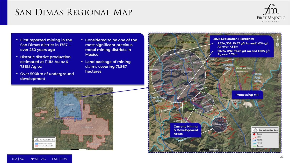 2024 Exploration Highlights: • First reported mining in the • Considered to be one of the • PE24_309: 10.87 g/t Au and 1,034 g/t San Dimas district in 1757 – most significant precious Ag over 7.88m over 250 years ago metal mining districts in • SIN24_092: 39.28 g/t Au and 1,905 g/t Ag over 1.76m. Mexico • Historic district production estimated at 11.1M Au oz & • Land package of mining 756M Ag oz claims covering 71,867 hectares • Over 500km of underground development Processing Mill Current Mining & Development Areas 22 TSX | AG NYSE | AG FSE | FMV