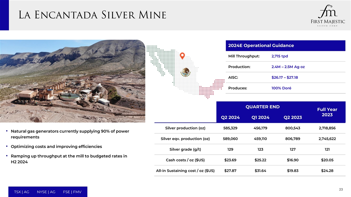 2024E Operational Guidance Mill Throughput: 2,715 tpd Production: 2.4M – 2.5M Ag oz AISC: $26.17 – $27.18 Produces: 100% Doré QUARTER END Full Year 2023 Q2 2024 Q1 2024 Q2 2023 Silver production (oz) 585,329 456,179 800,543 2,718,856 • Natural gas generators currently supplying 90% of power requirements Silver eqv. production (oz) 589,060 459,110 806,789 2,745,622 • Optimizing costs and improving efficiencies Silver grade (g/t) 129 123 127 121 • Ramping up throughput at the mill to budgeted rates in Cash costs / oz ($US) $23.69 $25.22 $16.90 $20.05 H2 2024 All-in Sustaining cost / oz ($US) $27.87 $31.64 $19.83 $24.28 23 TSX | AG NYSE | AG FSE | FMV