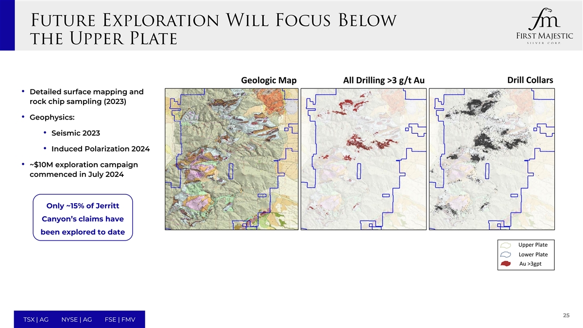 Geologic Map All Drilling >3 g/t Au Drill Collars • Detailed surface mapping and rock chip sampling (2023) • Geophysics: • Seismic 2023 • Induced Polarization 2024 • ~$10M exploration campaign commenced in July 2024 Only ~15% of Jerritt Canyon’s claims have been explored to date Upper Plate Lower Plate Au >3gpt 25 TSX | AG NYSE | AG FSE | FMV
