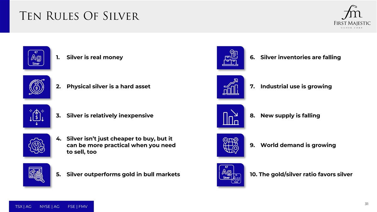 1. Silver is real money 6. Silver inventories are falling 2. Physical silver is a hard asset 7. Industrial use is growing 3. Silver is relatively inexpensive 8. New supply is falling 4. Silver isn’t just cheaper to buy, but it can be more practical when you need 9. World demand is growing to sell, too 5. Silver outperforms gold in bull markets 10. The gold/silver ratio favors silver 31 TSX | AG NYSE | AG FSE | FMV