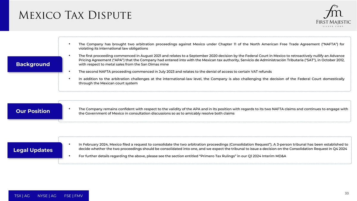 • The Company has brought two arbitration proceedings against Mexico under Chapter 11 of the North American Free Trade Agreement (“NAFTA”) for violating its international law obligations • The first proceeding commenced in August 2021 and relates to a September 2020 decision by the Federal Court in Mexico to retroactively nullify an Advance Pricing Agreement (“APA”) that the Company had entered into with the Mexican tax authority, Servicio de Administración Tributaria ( SAT ), in October 2012, with respect to metal sales from the San Dimas mine Background • The second NAFTA proceeding commenced in July 2023 and relates to the denial of access to certain VAT refunds • In addition to the arbitration challenges at the international-law level, the Company is also challenging the decision of the Federal Court domestically through the Mexican court system • The Company remains confident with respect to the validity of the APA and in its position with regards to its two NAFTA claims and continues to engage with Our Position the Government of Mexico in consultation discussions so as to amicably resolve both claims • In February 2024, Mexico filed a request to consolidate the two arbitration proceedings (Consolidation Request”). A 3-person tribunal has been established to decide whether the two proceedings should be consolidated into one, and we expect the tribunal to issue a decision on the Consolidation Request in Q4 2024 Legal Updates • For further details regarding the above, please see the section entitled “Primero Tax Rulings” in our Q1 2024 Interim MD&A 33 TSX | AG NYSE | AG FSE | FMV