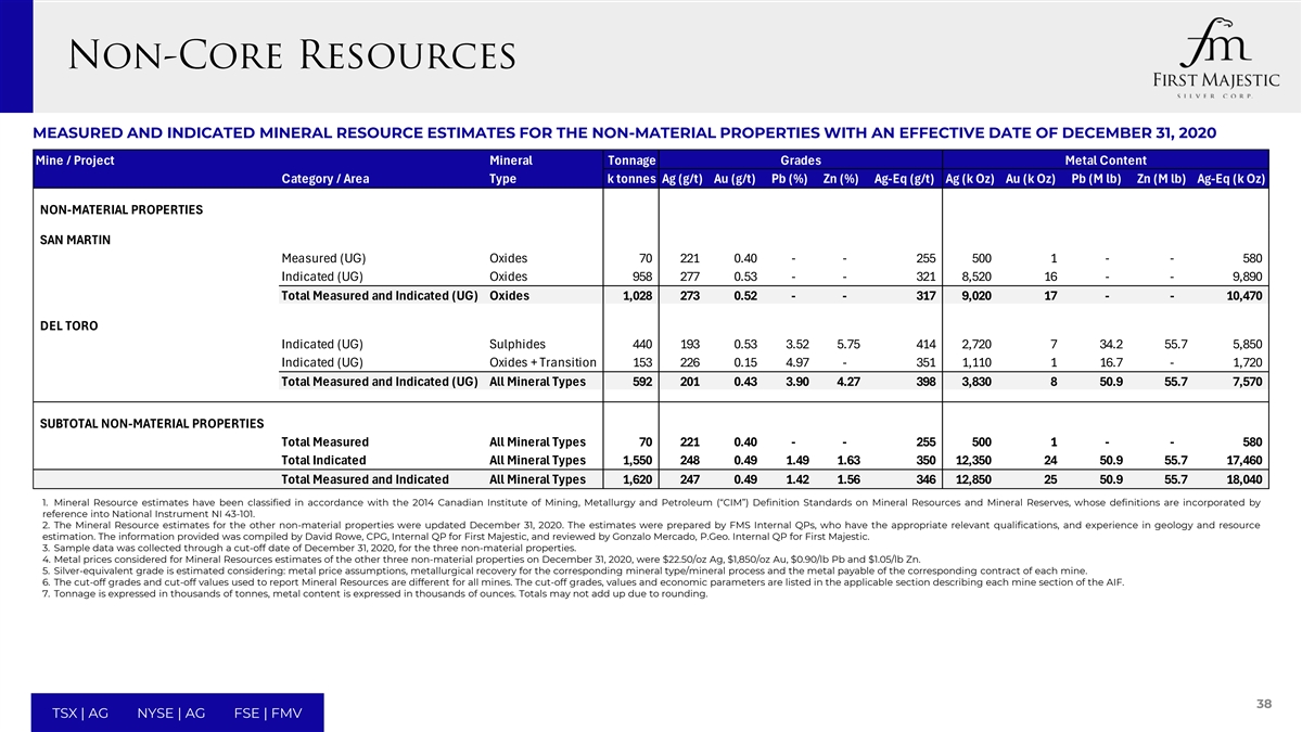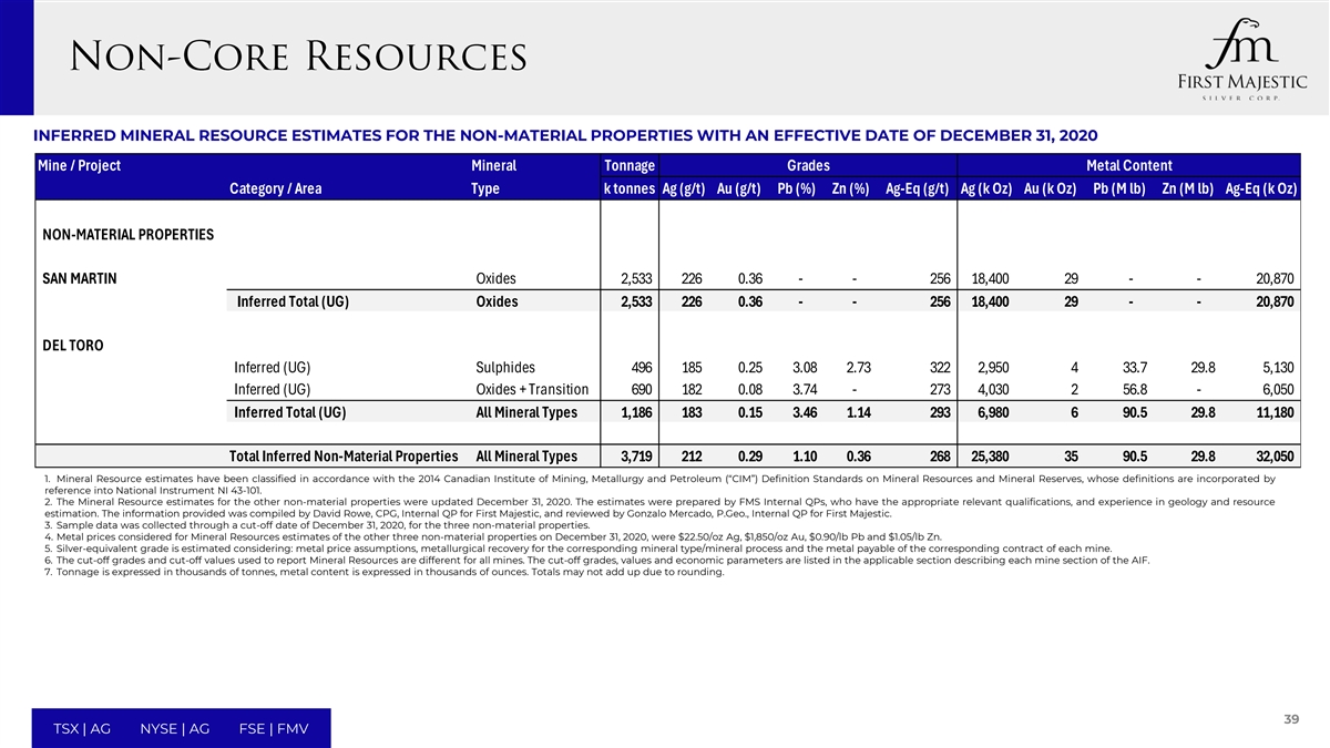 MEASURED AND INDICATED MINERAL RESOURCE ESTIMATES FOR THE NON-MATERIAL PROPERTIES WITH AN EFFECTIVE DATE OF DECEMBER 31, 2020 Mine / Project Mineral Tonnage Grades Metal Content Category / Area Type k tonnes Ag (g/t) Au (g/t) Pb (%) Zn (%) Ag-Eq (g/t) Ag (k Oz) Au (k Oz) Pb (M lb) Zn (M lb) Ag-Eq (k Oz) NON-MATERIAL PROPERTIES SAN MARTIN Measured (UG) Oxides 70 221 0 .40 - - 255 500 1 - - 580 Indicated (UG) Oxides 958 277 0.53 - - 321 8,520 16 - - 9,890 Total Measured and Indicated (UG) Oxides 1,028 273 0.52 - - 317 9 ,020 17 - - 1 0,470 DEL TORO Indicated (UG) Sulphides 440 193 0.53 3.52 5.75 414 2,720 7 34.2 55.7 5,850 Indicated (UG) Oxides + Transition 153 226 0 .15 4.97 - 351 1,110 1 16.7 - 1,720 Total Measured and Indicated (UG) All Mineral Types 592 201 0.43 3.90 4.27 398 3,830 8 5 0.9 5 5.7 7 ,570 SUBTOTAL NON-MATERIAL PROPERTIES Total Measured All Mineral Types 70 221 0.40 - - 255 500 1 - - 580 Total Indicated All Mineral Types 1 ,550 248 0.49 1.49 1.63 350 1 2,350 24 5 0.9 55.7 17,460 Total Measured and Indicated All Mineral Types 1,620 247 0.49 1.42 1.56 346 12,850 25 50.9 55.7 18,040 1. Mineral Resource estimates have been classified in accordance with the 2014 Canadian Institute of Mining, Metallurgy and Petroleum (“CIM”) Definition Standards on Mineral Resources and Mineral Reserves, whose definitions are incorporated by reference into National Instrument NI 43-101. 2. The Mineral Resource estimates for the other non-material properties were updated December 31, 2020. The estimates were prepared by FMS Internal QPs, who have the appropriate relevant qualifications, and experience in geology and resource estimation. The information provided was compiled by David Rowe, CPG, Internal QP for First Majestic, and reviewed by Gonzalo Mercado, P.Geo. Internal QP for First Majestic. 3. Sample data was collected through a cut-off date of December 31, 2020, for the three non-material properties. 4. Metal prices considered for Mineral Resources estimates of the other three non-material properties on December 31, 2020, were $22.50/oz Ag, $1,850/oz Au, $0.90/lb Pb and $1.05/lb Zn. 5. Silver-equivalent grade is estimated considering: metal price assumptions, metallurgical recovery for the corresponding mineral type/mineral process and the metal payable of the corresponding contract of each mine. 6. The cut-off grades and cut-off values used to report Mineral Resources are different for all mines. The cut-off grades, values and economic parameters are listed in the applicable section describing each mine section of the AIF. 7. Tonnage is expressed in thousands of tonnes, metal content is expressed in thousands of ounces. Totals may not add up due to rounding. 38 TSX | AG NYSE | AG FSE | FMV